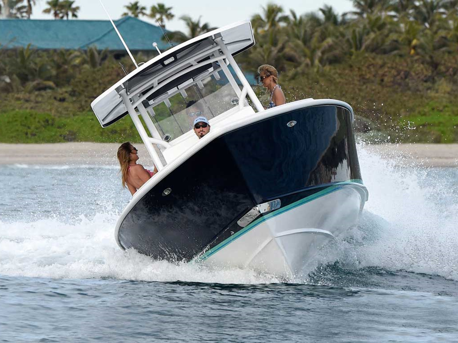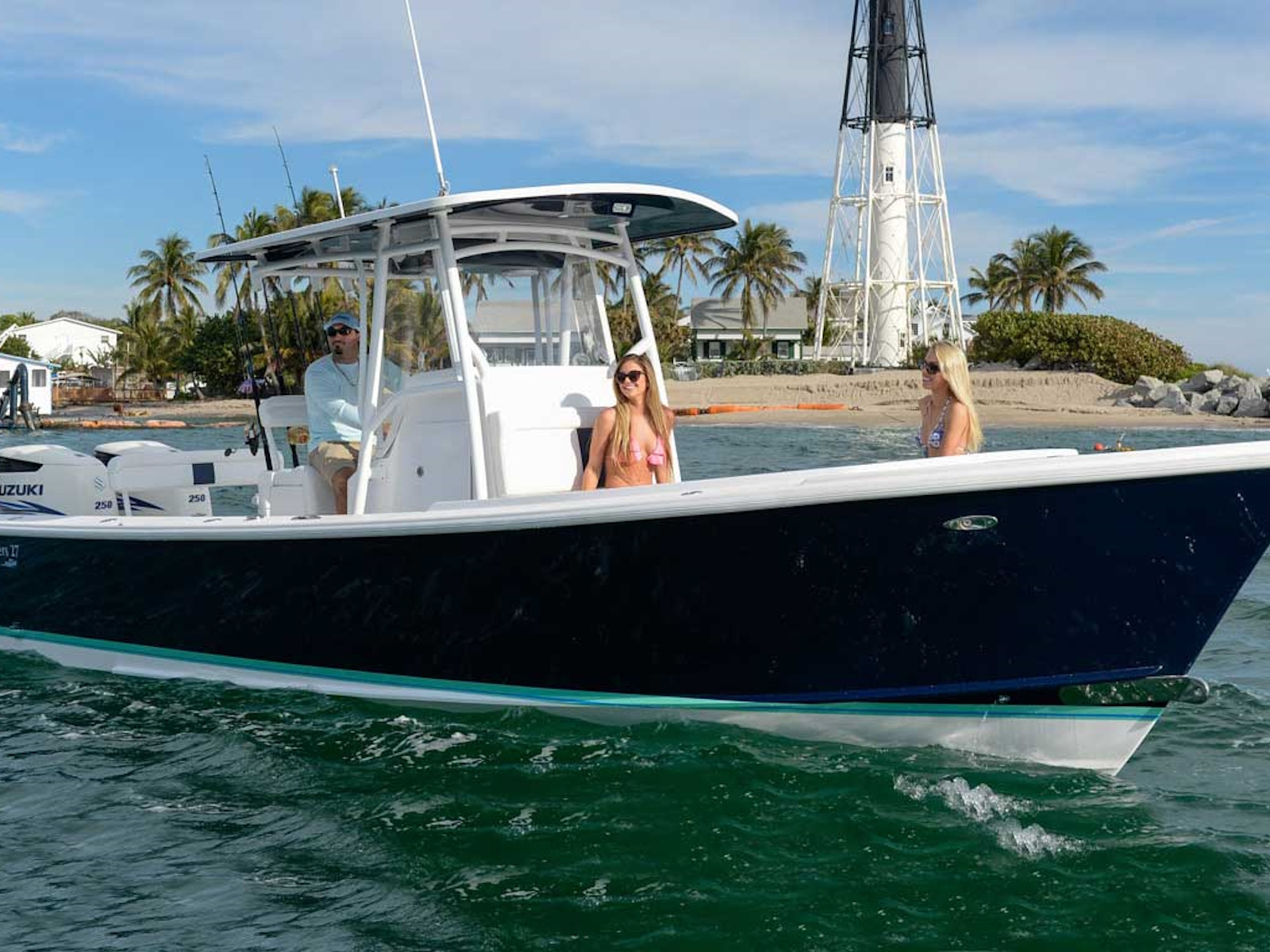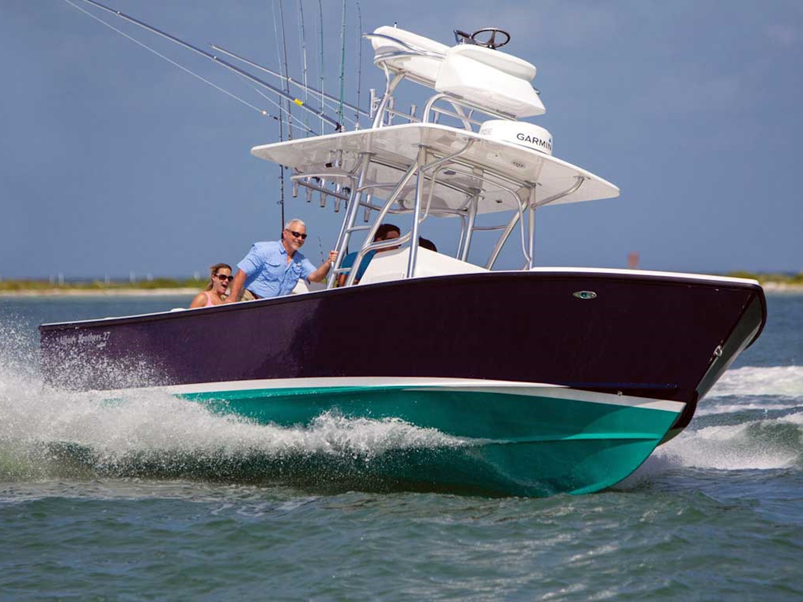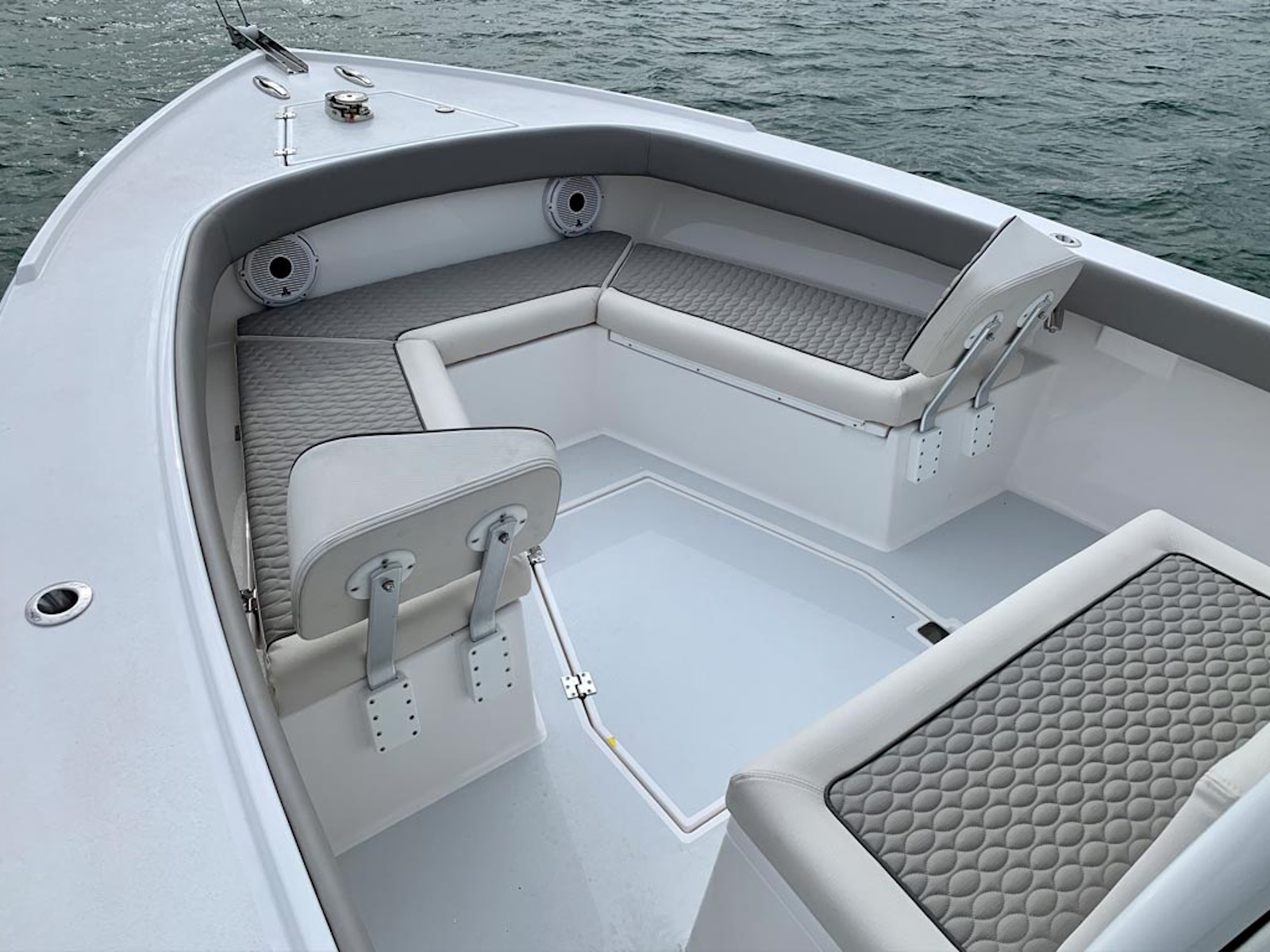 When you climb aboard, notice she barely rocks. Your next surprise is how stiff she is at the dock, or at sea. Starting our tour aft, she has room for diving, fishing, bean bags, a live well and rear bench seat. As you move forward and up to the bow, you’ll notice the wide decks and large proportions flow through the boat. The console is the right height to see over, yet the headroom inside is ample. Find comfortable seating for 4-6 people around the forward seats plus 2 on the console seat. Eight people socializing is a good time anchored up, or at your favorite sandbar. If you’re a hard core fisherman, we offer her in a flush deck version.