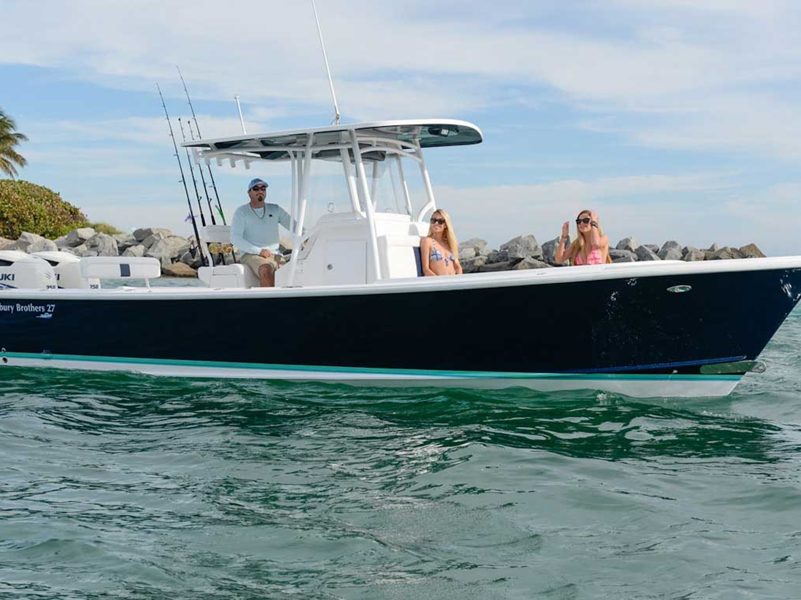 In addition to being spacious, she is also the fastest in our fleet. The 27 boasts a top speed of 53 mph with a full tank and crew. This hull’s ability to track through tall waves, at speed, is outstanding. Even with big swells and stiff chop, you won’t hear chine slap or hatches slam. For more relaxing days, bring it back to 3500 rpm…your getting 2 mpg at 30 mph for optimal cruising speed. Kick back and enjoy the ride, for 360 miles. For those interested in even more economy, a single engine outboards is a option.