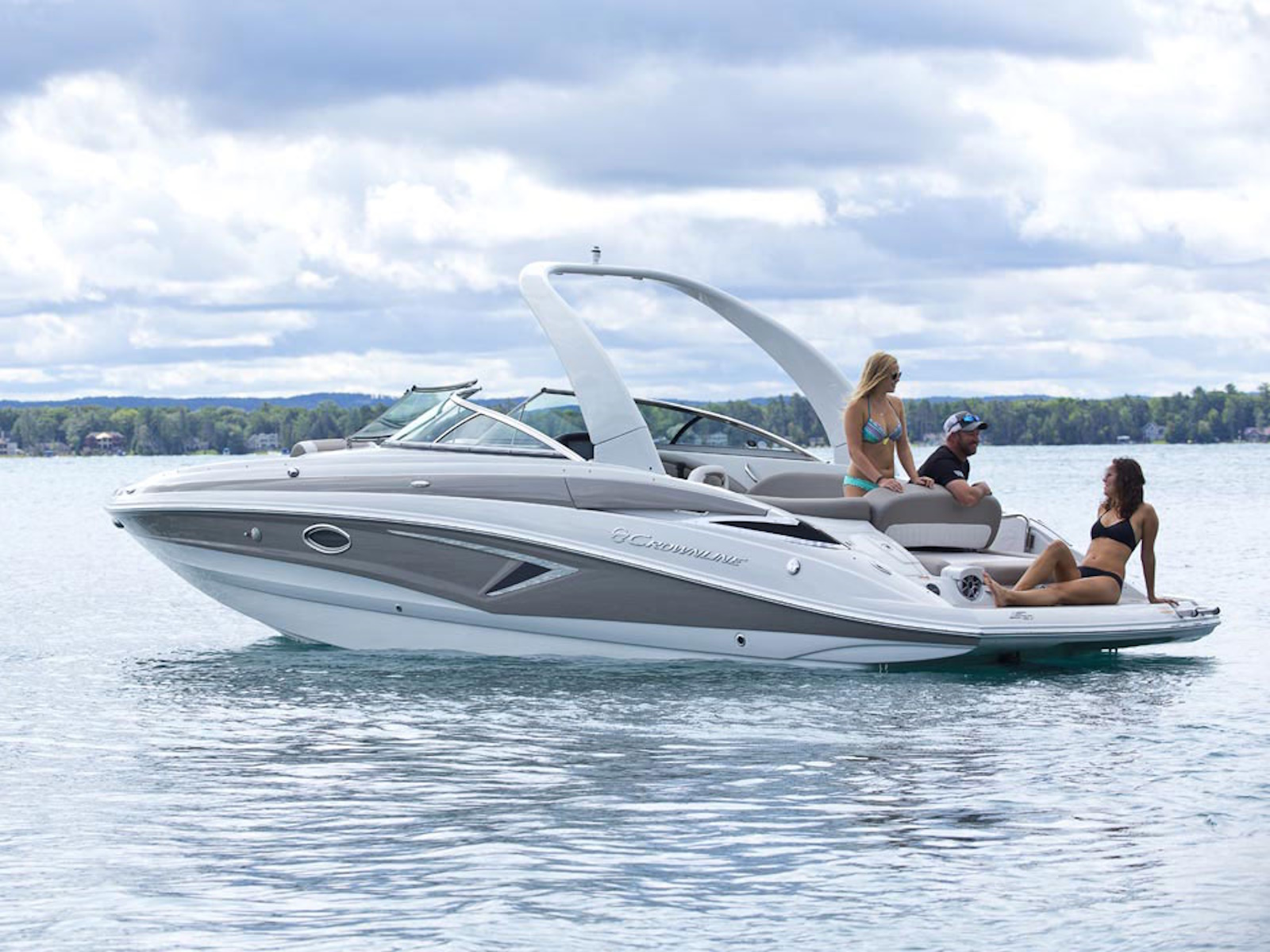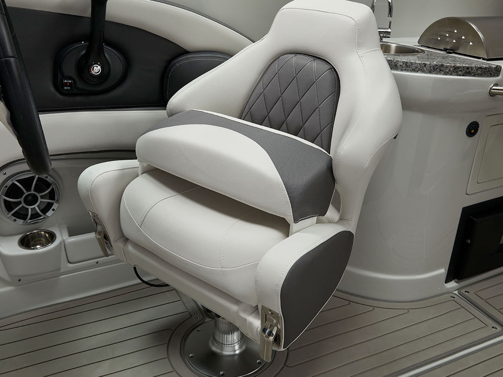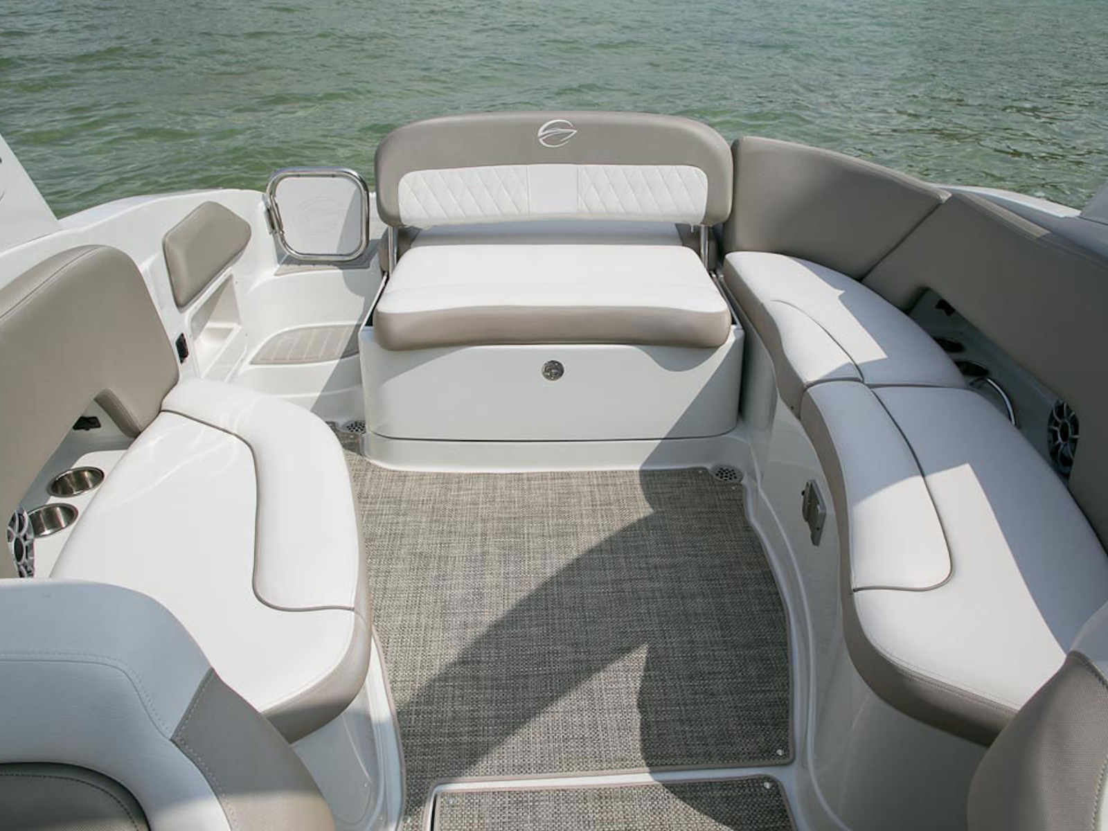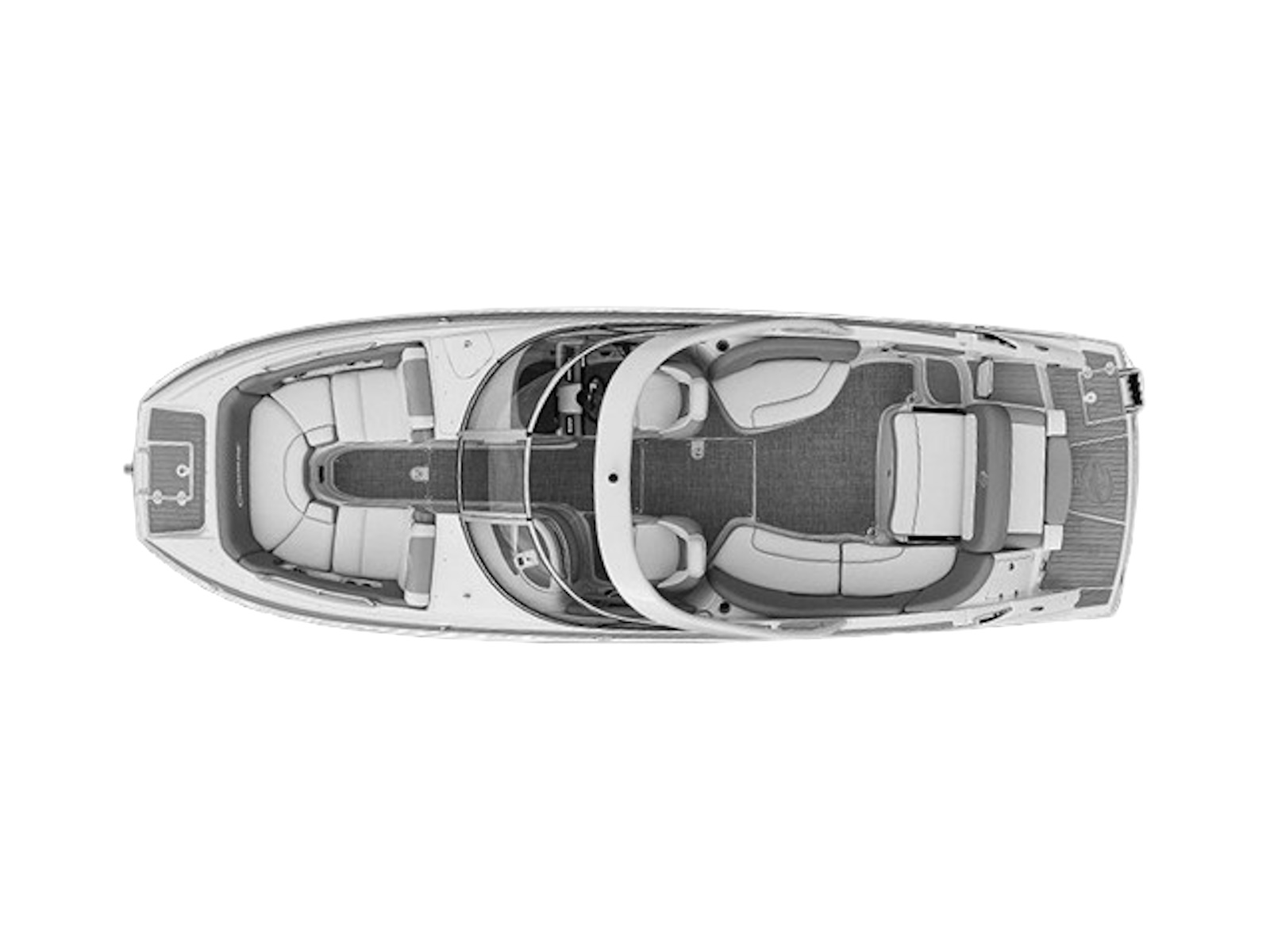 There’s plenty of room for all your toys and gear on this crossover model that melds the F.A.S.T. Tab® performance and stylish lines of a bowrider with the roominess and comfort of a family-friendly deck boat. This boat features a conversation-friendly, J-shaped cockpit interior, aft electric sun lounge seat, beautifully appointed enclosed head compartment, Wet Sounds stereo with eight Wet Sounds speakers, and a twin 7″ Garmin touchscreen with LakeVü g3 maps.