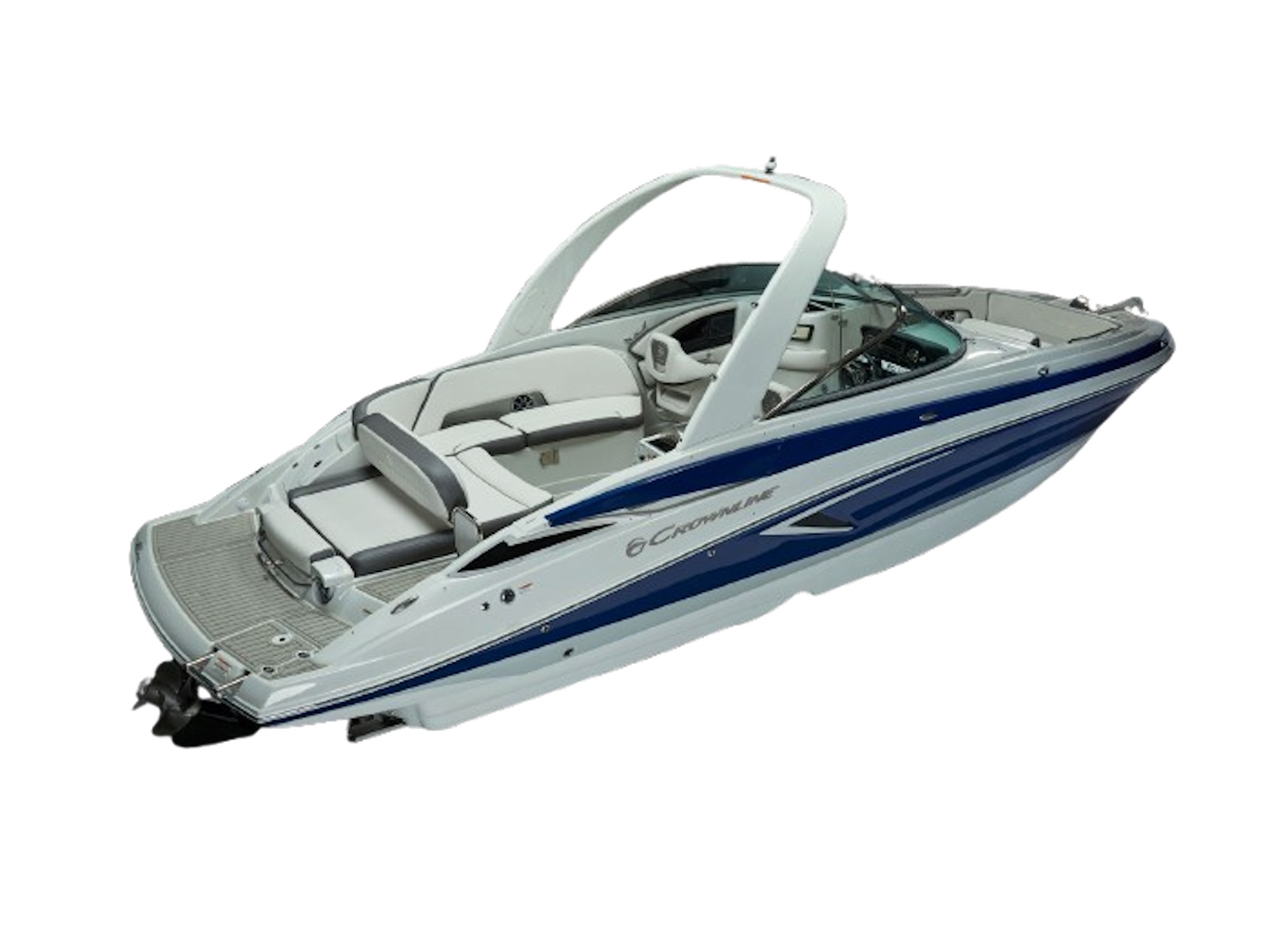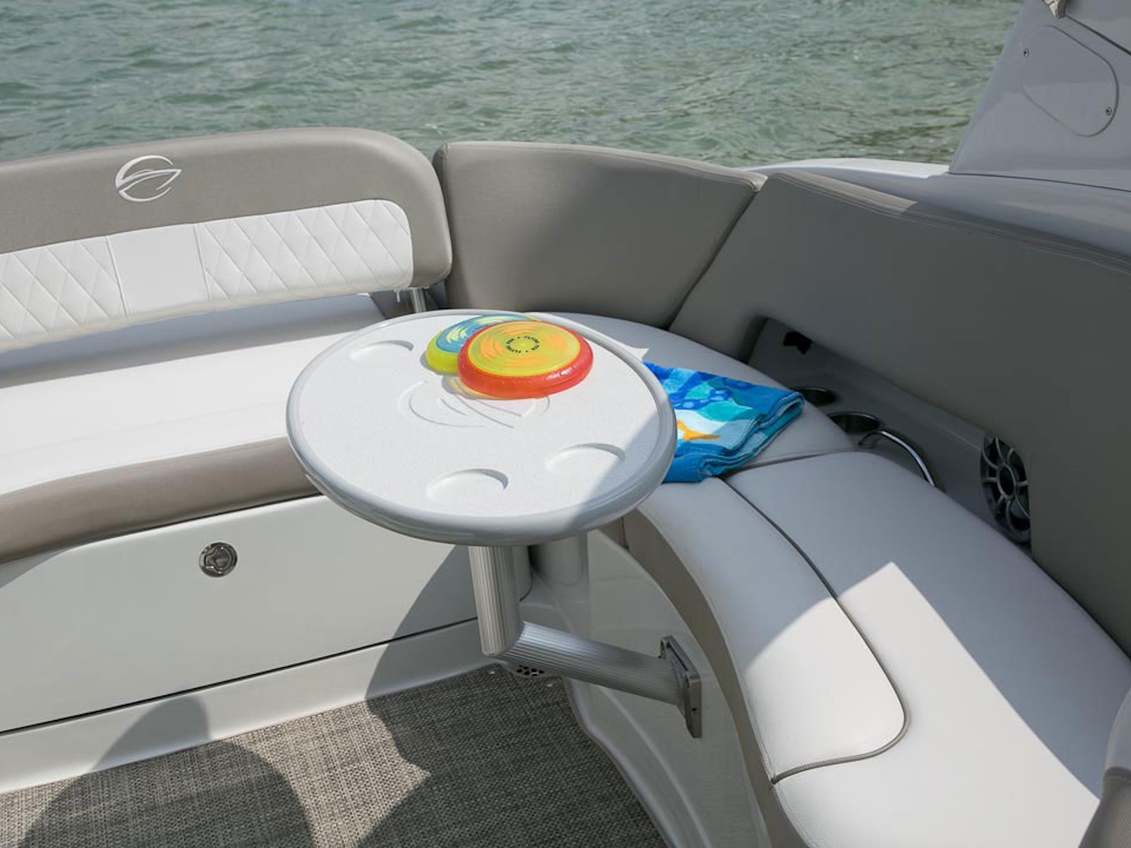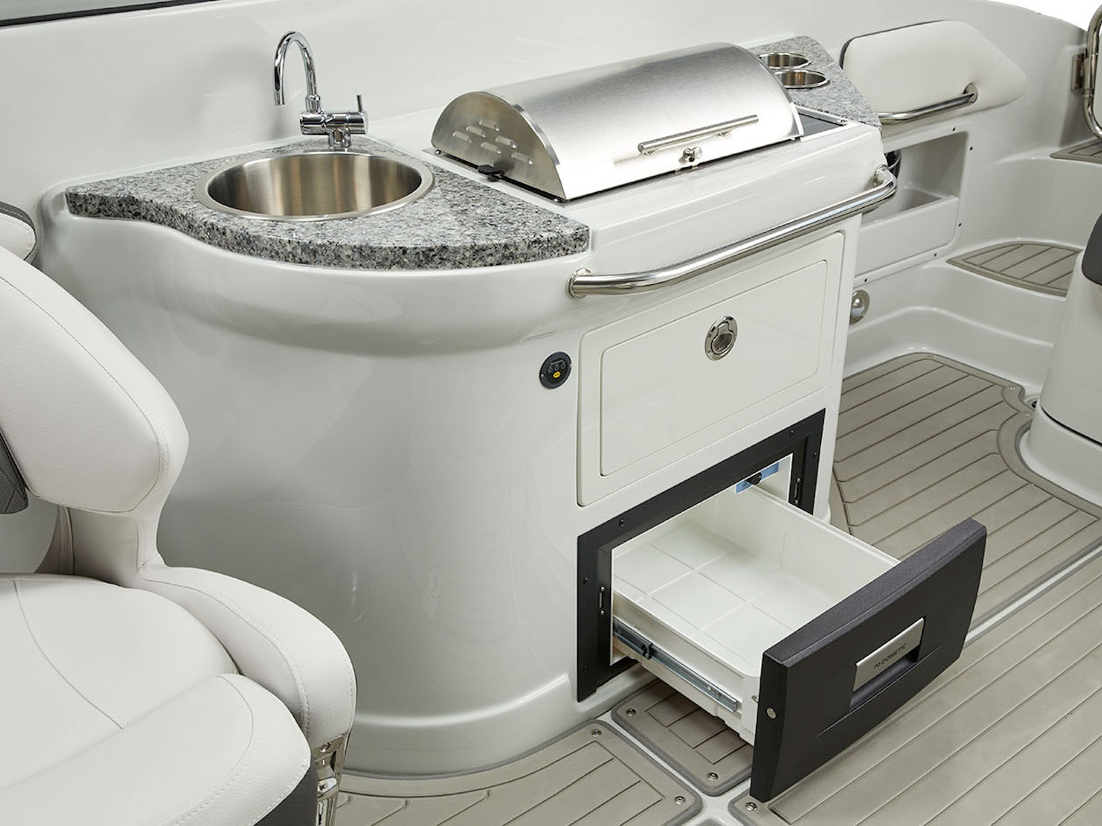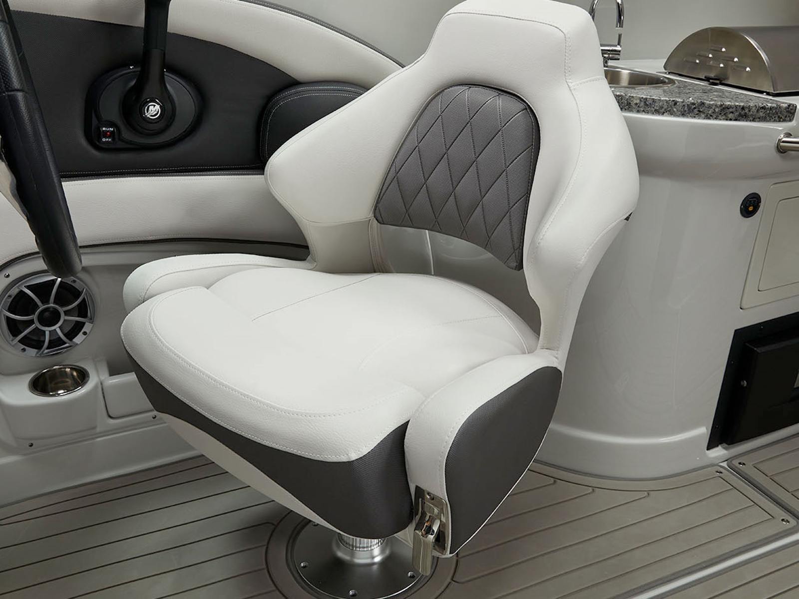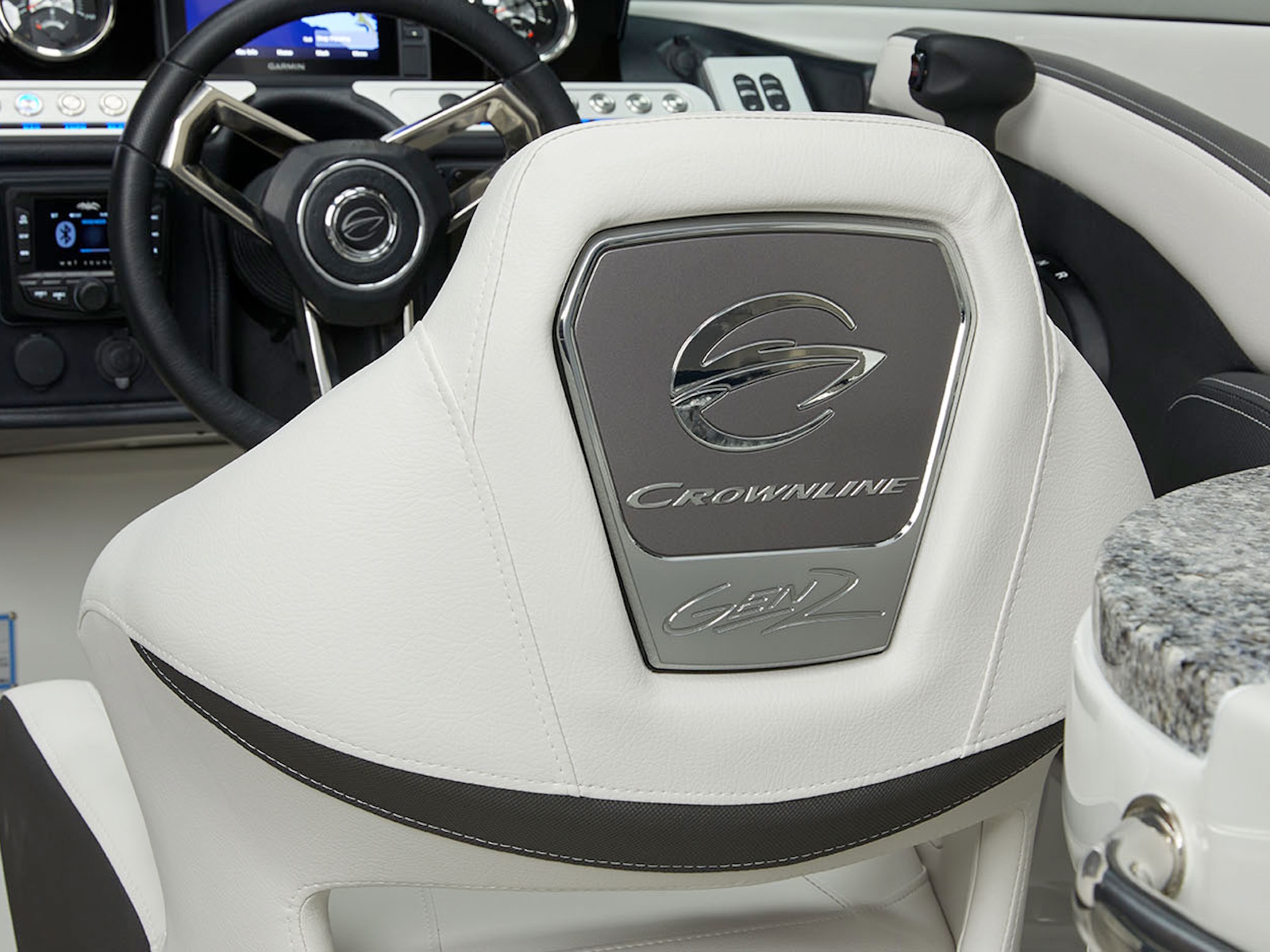 There’s plenty of room for all your toys and gear on this crossover model that melds the F.A.S.T. Tab® performance and stylish lines of a bowrider with the roominess and comfort of a family-friendly deck boat. This boat features a conversation-friendly, J-shaped cockpit interior, aft electric sun lounge seat, beautifully appointed enclosed head compartment, Wet Sounds stereo with eight Wet Sounds speakers, and a twin 7″ Garmin touchscreen with LakeVü g3 maps.