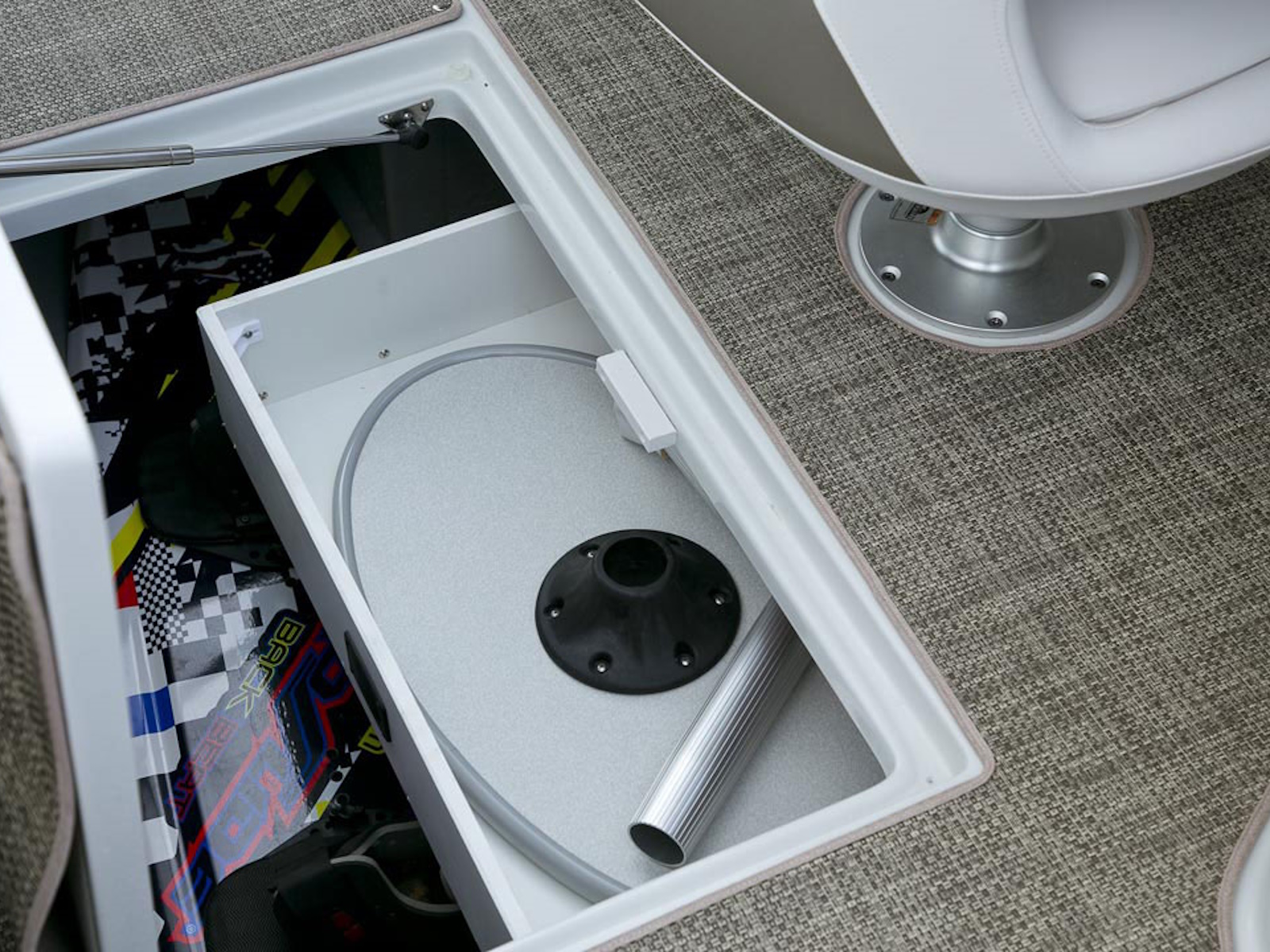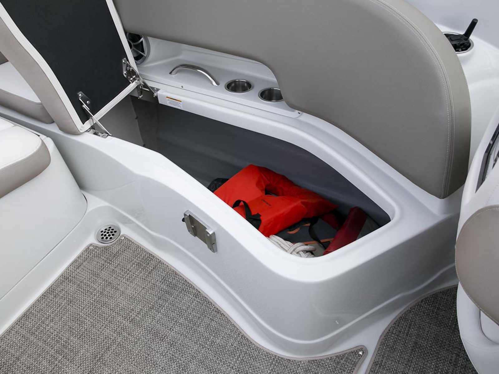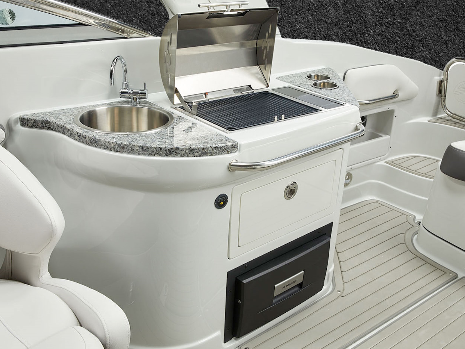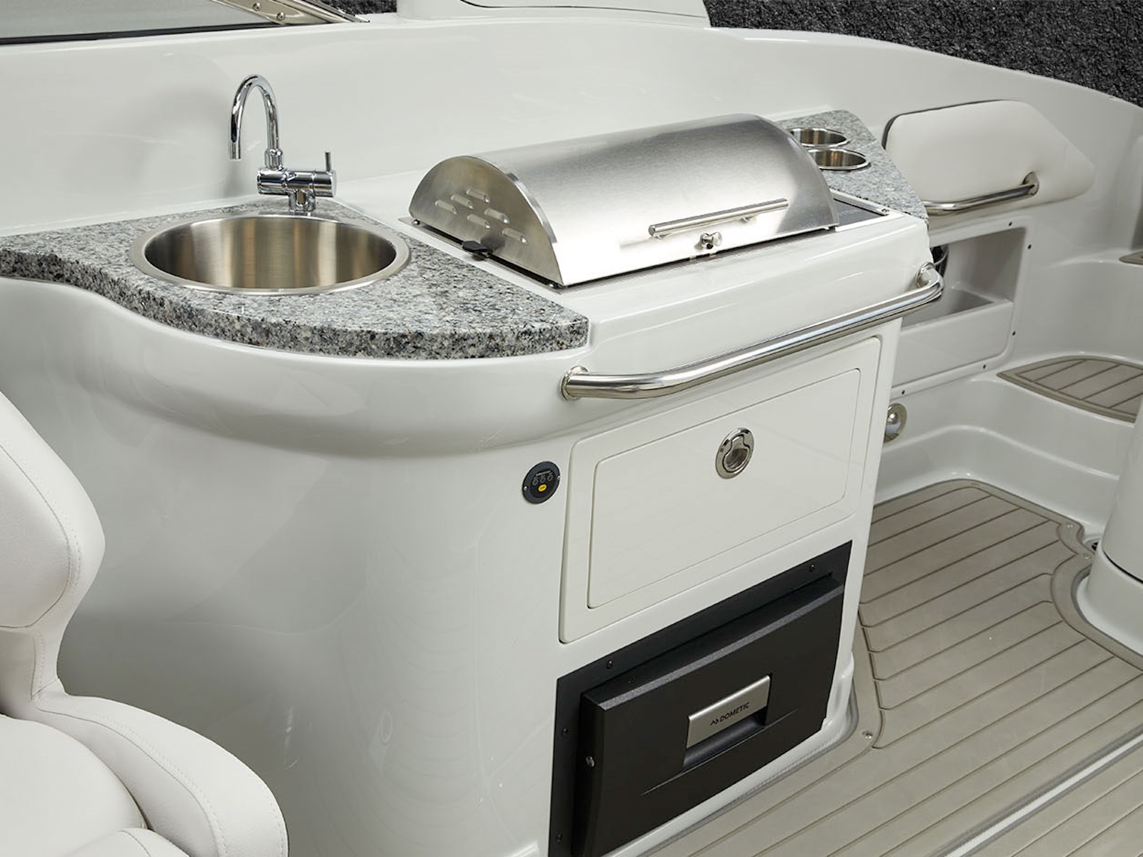 There’s plenty of room for all your toys and gear on this crossover model that melds the F.A.S.T. Tab® performance and stylish lines of a bowrider with the roominess and comfort of a family-friendly deck boat. This boat features a conversation-friendly, J-shaped cockpit interior, aft electric sun lounge seat, beautifully appointed enclosed head compartment, Wet Sounds stereo with eight Wet Sounds speakers, and a twin 7″ Garmin touchscreen with LakeVü g3 maps.