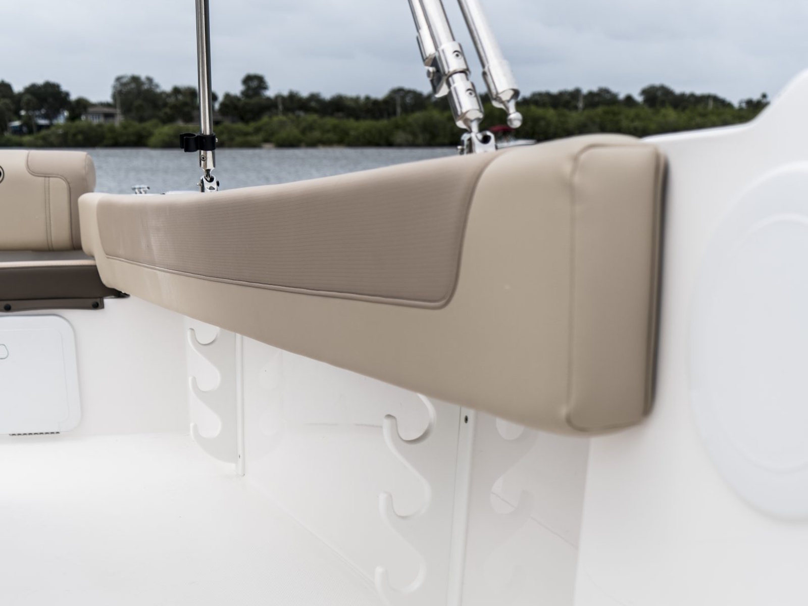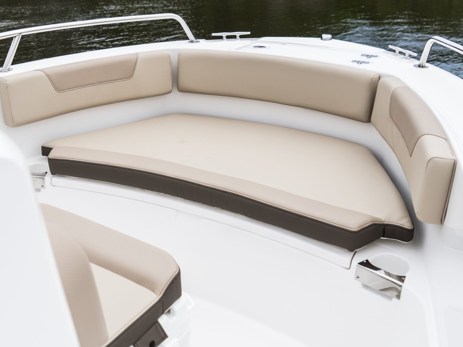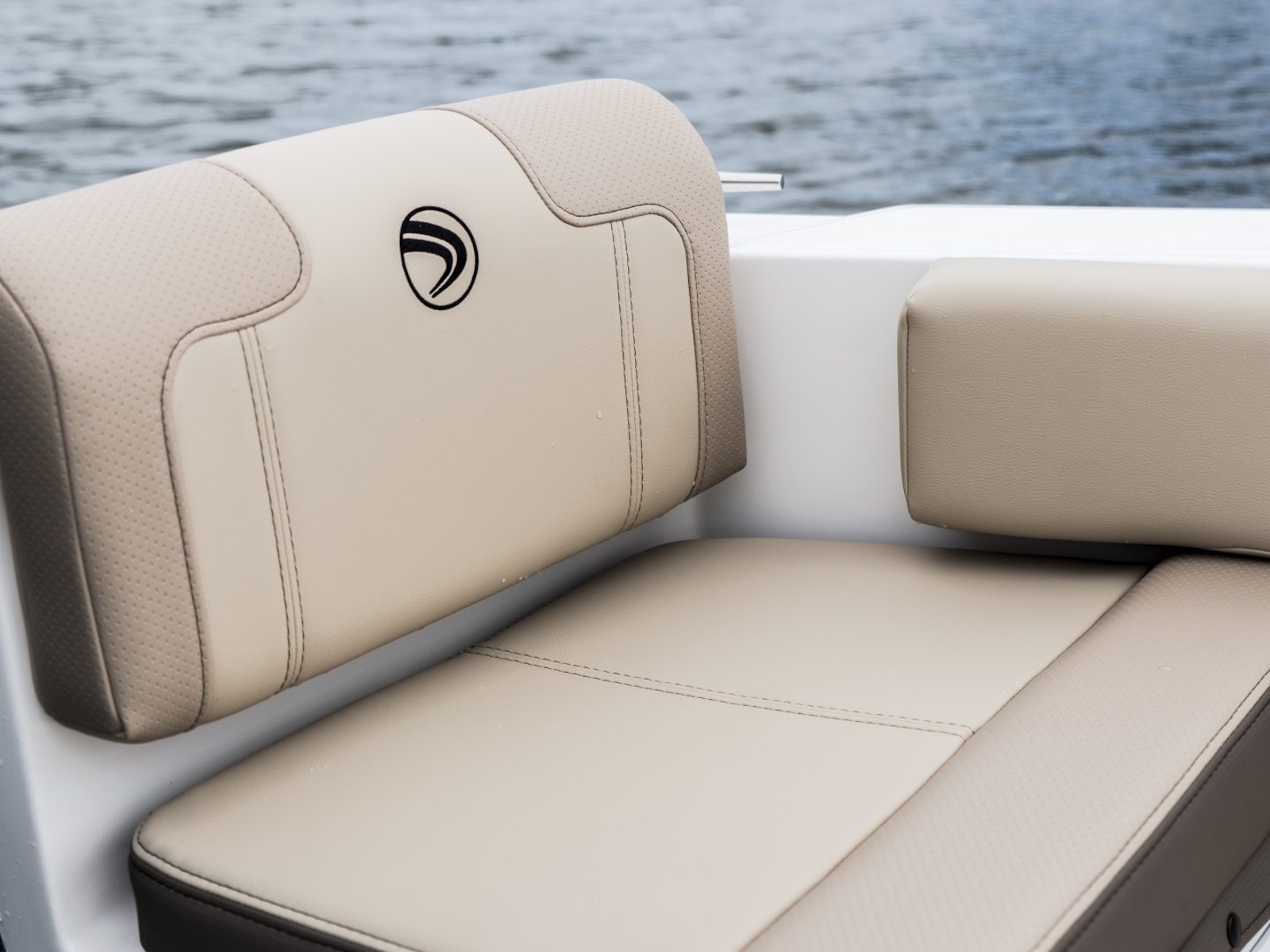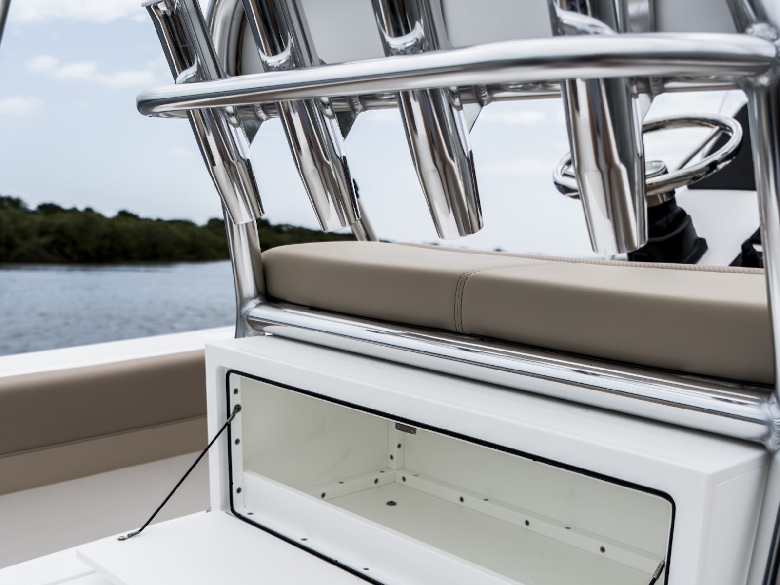 "With 66 square feet of cockpit space, there’s plenty of room for a console storage box, seat storage locker, console cooler seat and two transom quarter jump seats with durably upholstered cushions."