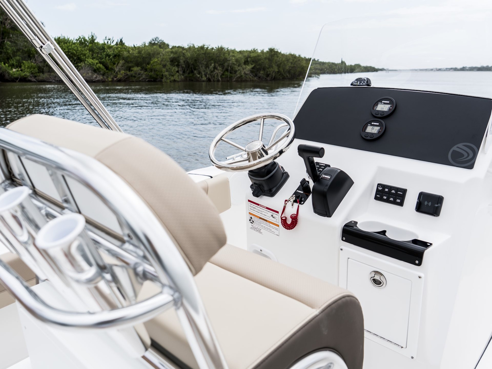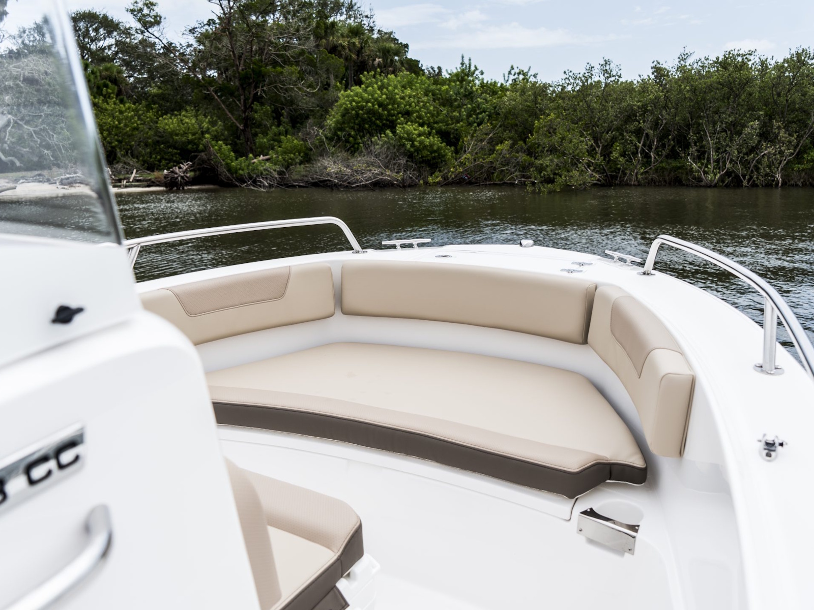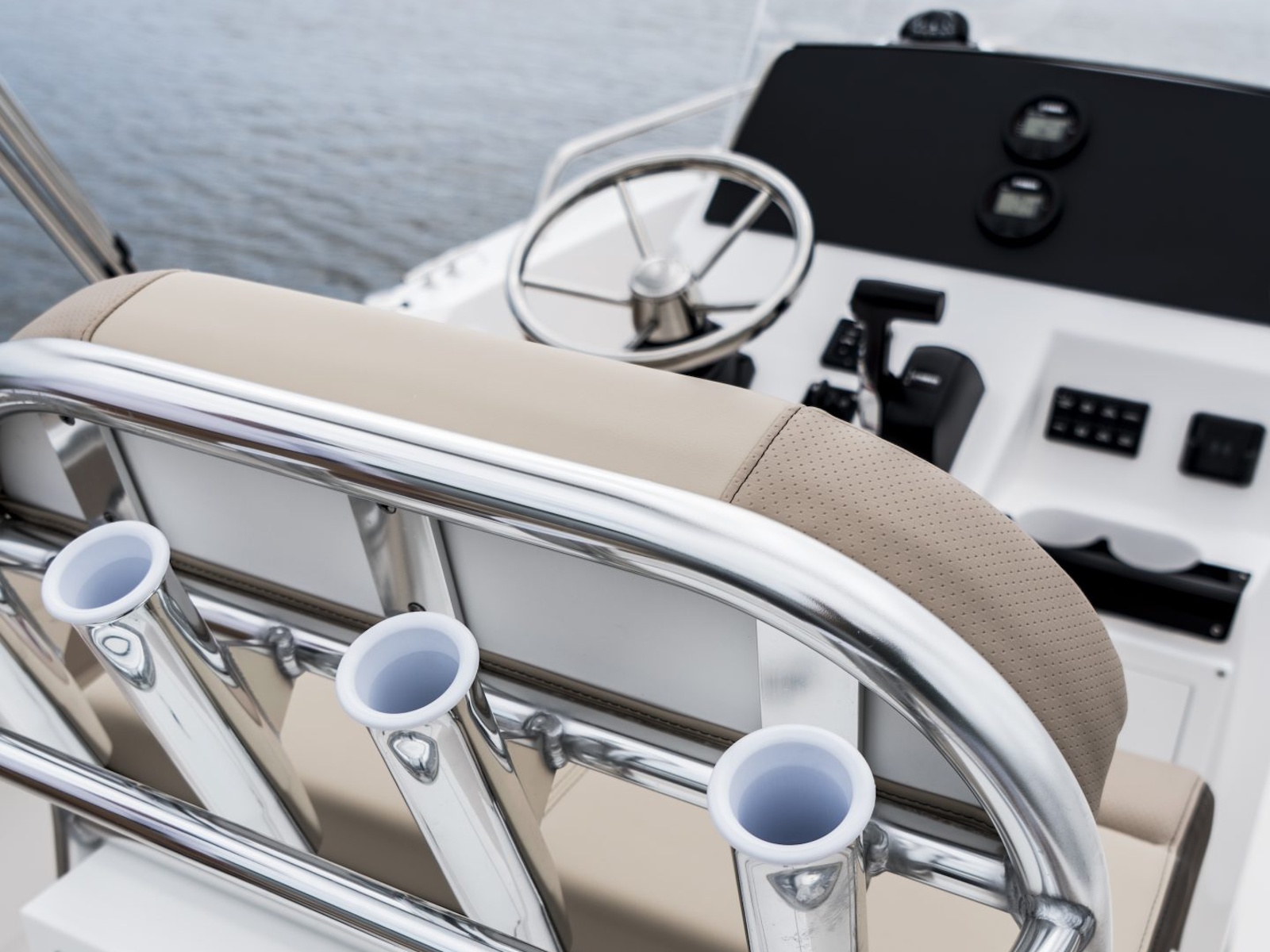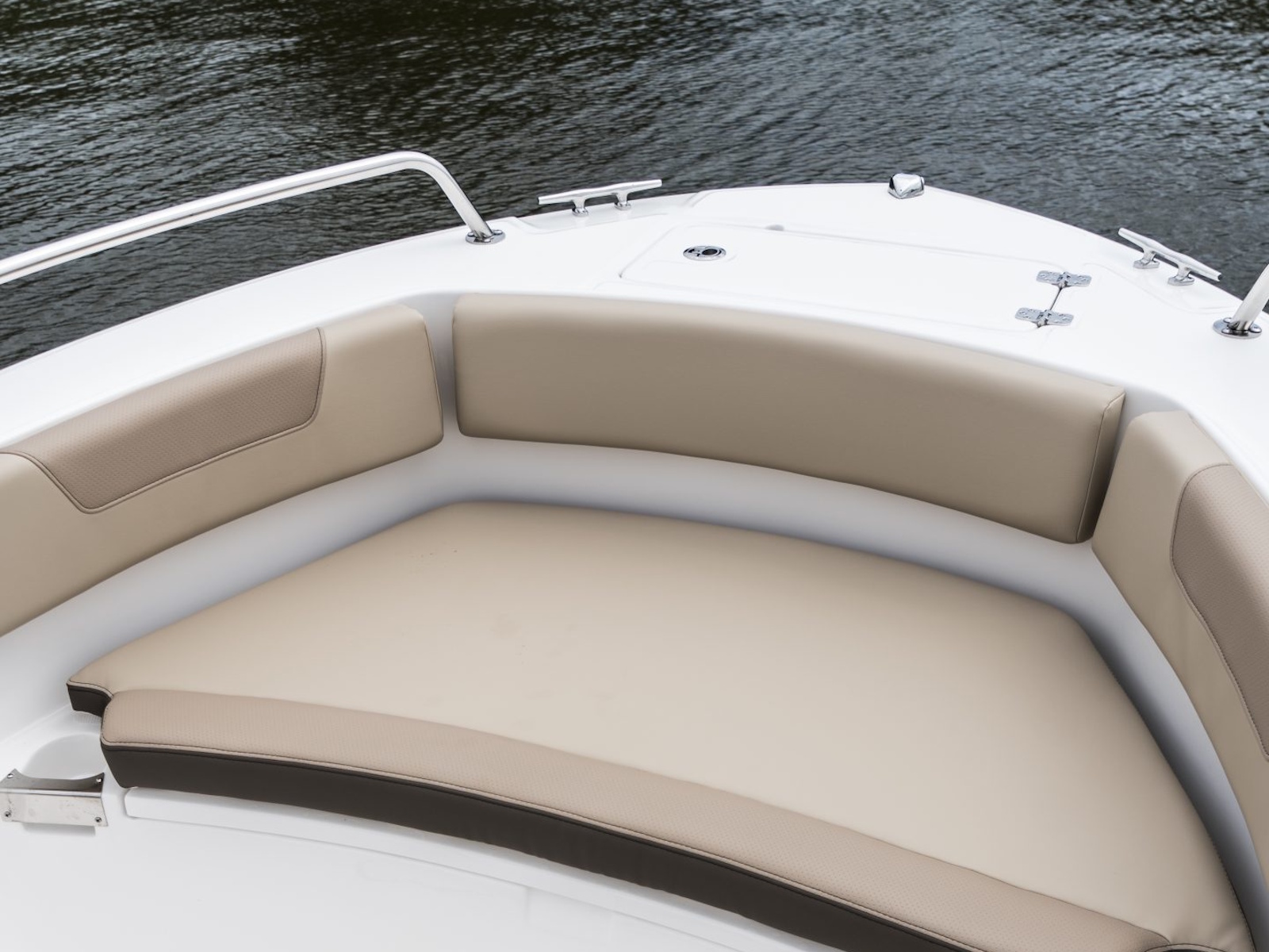 "With 66 square feet of cockpit space, there’s plenty of room for a console storage box, seat storage locker, console cooler seat and two transom quarter jump seats with durably upholstered cushions."