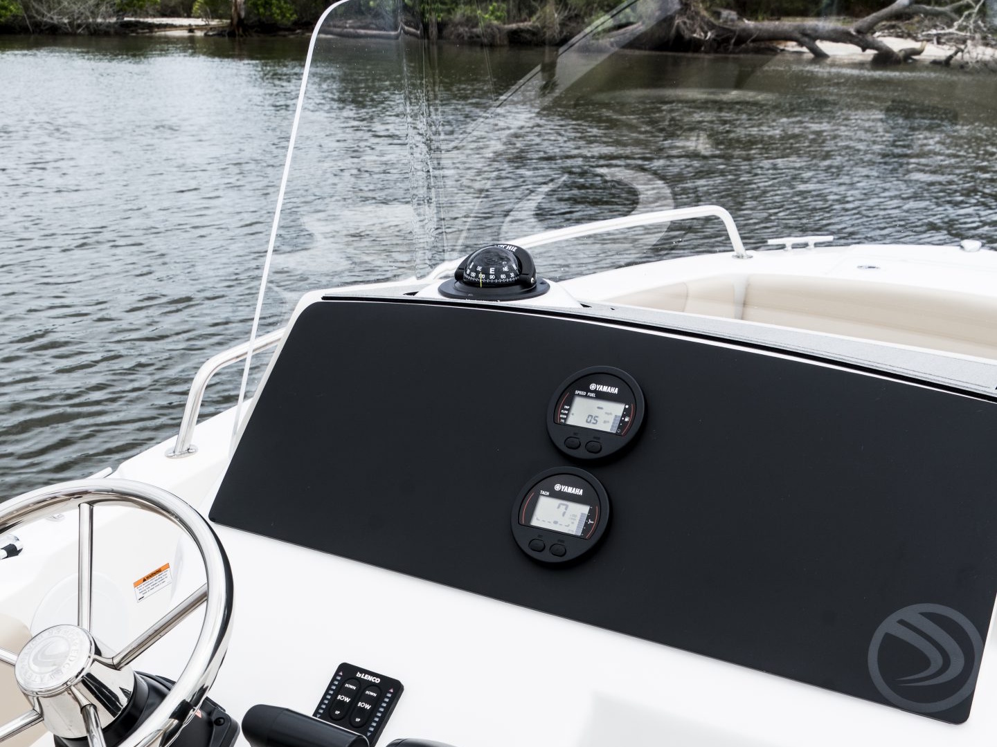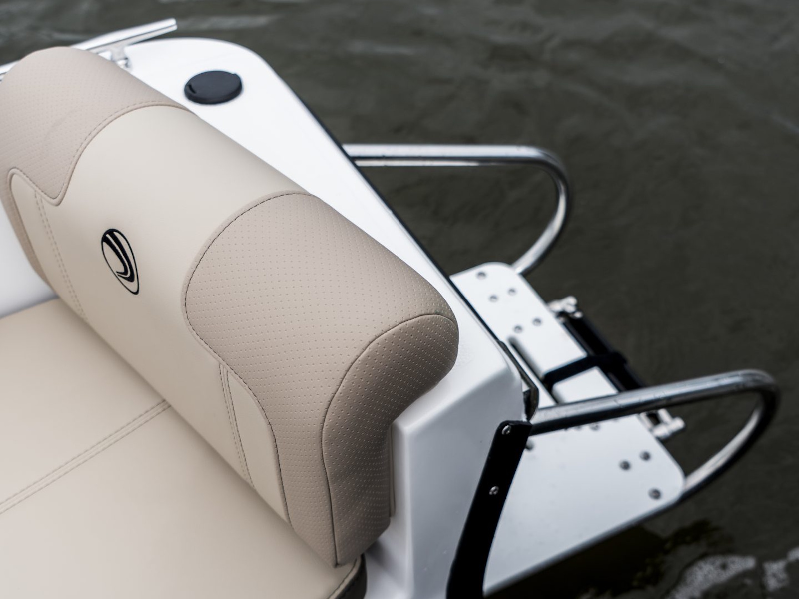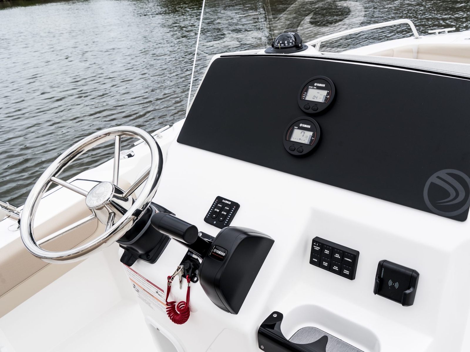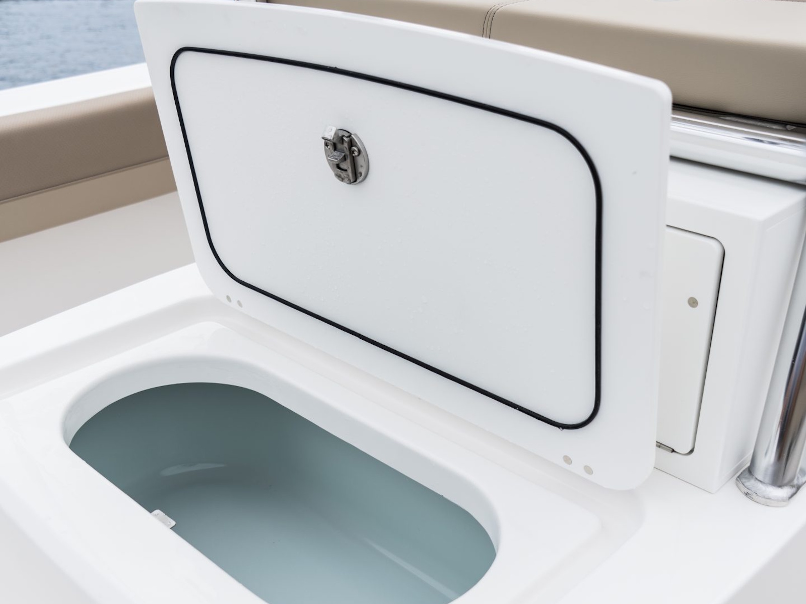 "With 66 square feet of cockpit space, there’s plenty of room for a console storage box, seat storage locker, console cooler seat and two transom quarter jump seats with durably upholstered cushions."