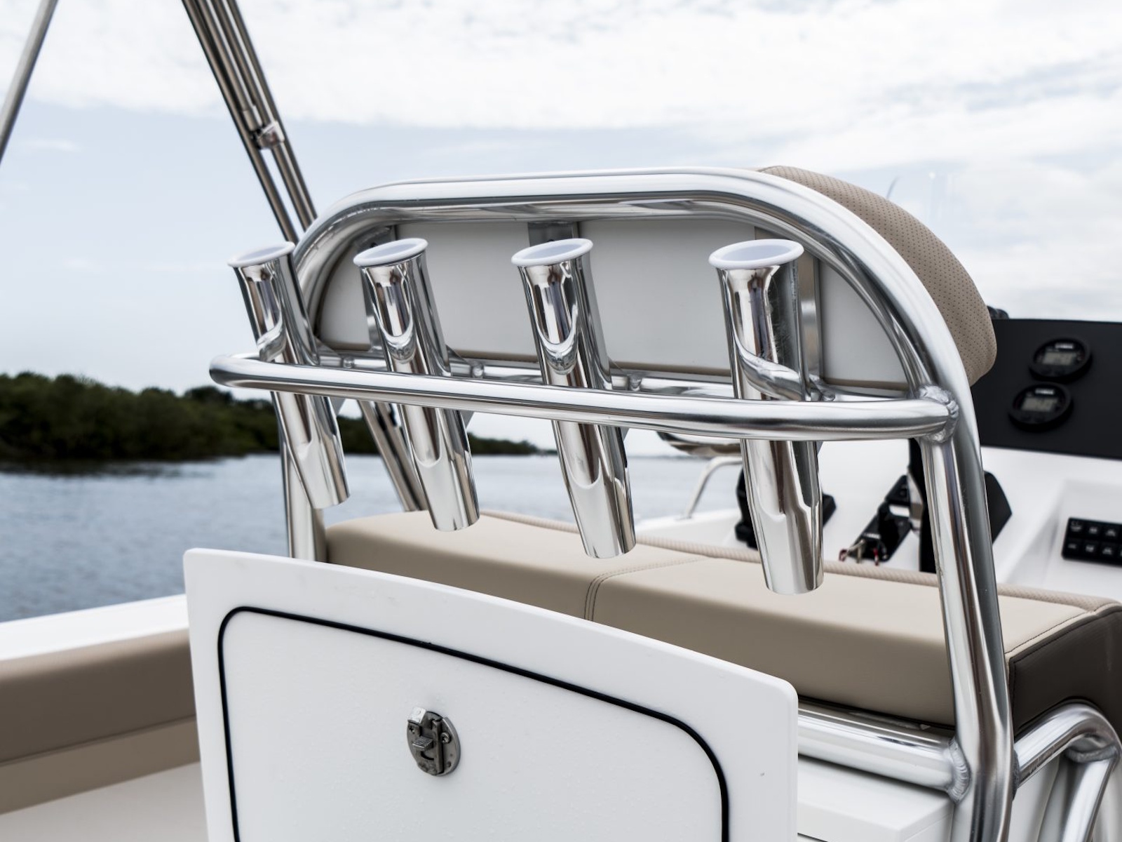 - Fishing Package, 17 gallon recirculating Baitwell, Raw water wash down, Extra gunnel Rod Holders (2), Console Rod Racks, Built-In Tackle Box