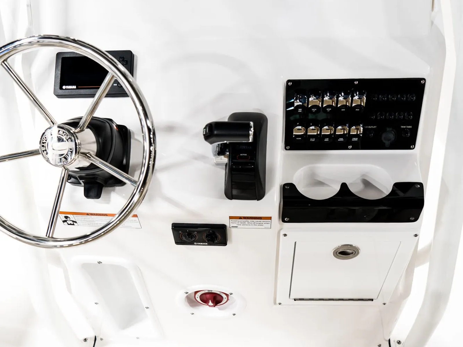 • White Yamaha F150 Four Stroke w/ Stainless Steel Prop, Fuel/Water Separator, Group 24 Battery & Box (2), Digital Tach (w/ Engine Trim, Hours, Trip & Warning Lights), Digital Speedo (w/ Fuel Level, Trip, Time, Volts & Low Fuel/Volt Alarms)