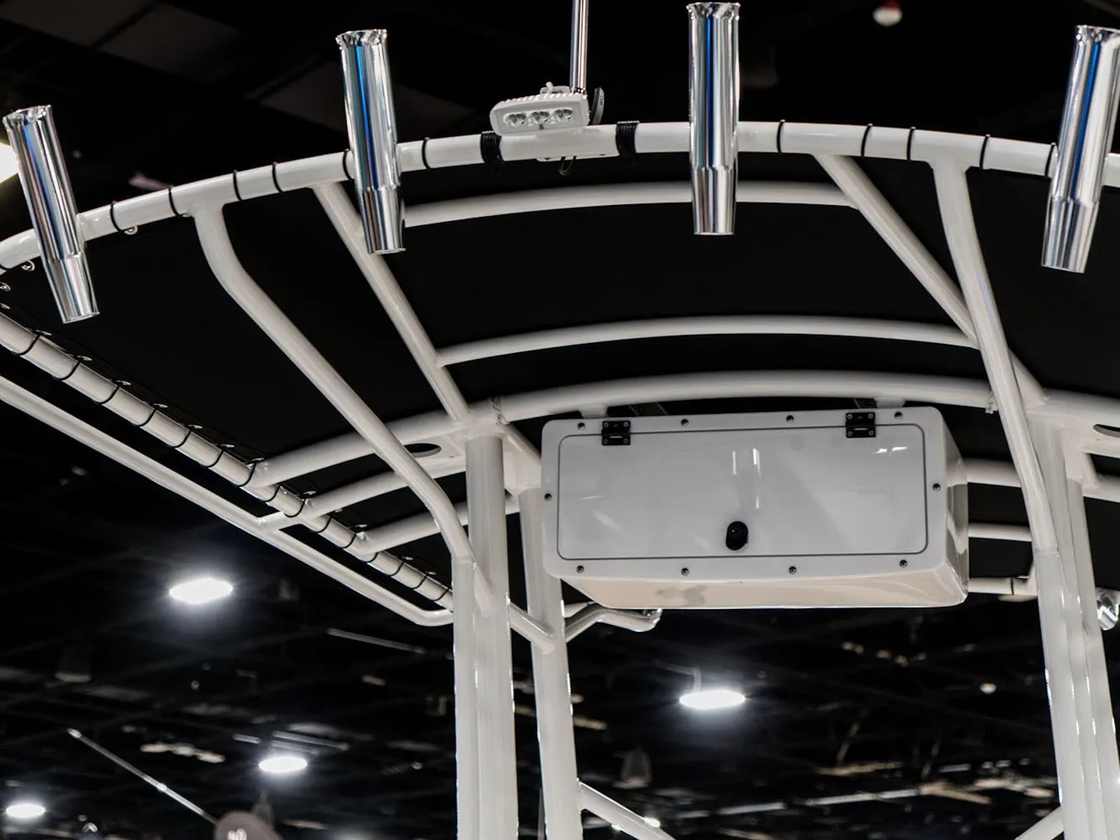 • Powdercoated Aluminum T-Top with Electronics Box, Rod Holders (4), & LED Spreader Lights (2)