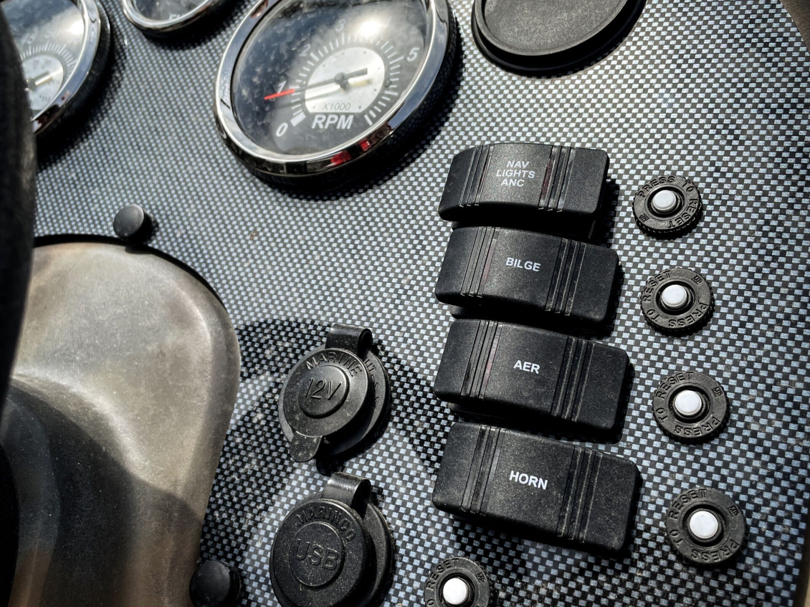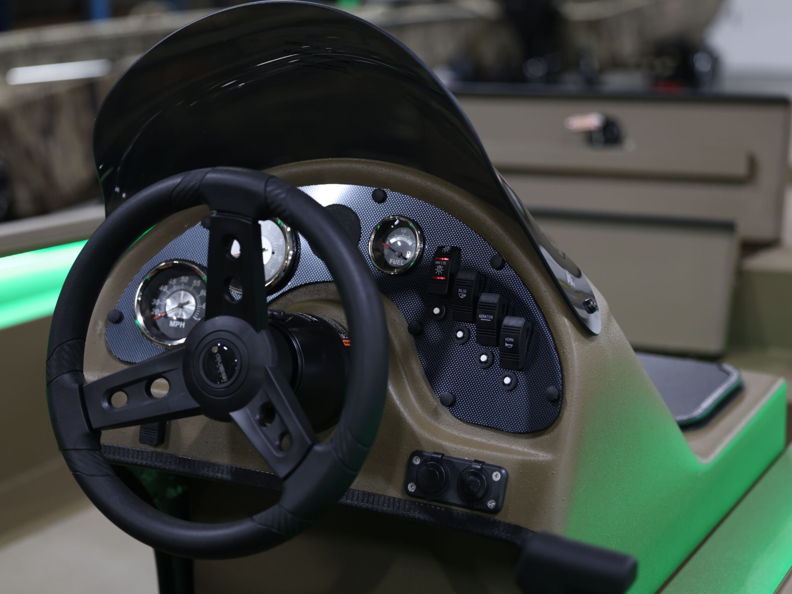 - Front Bow Control Panel w 12V Plug, Troll Motor Plug, Nav and Motor Trim Switches