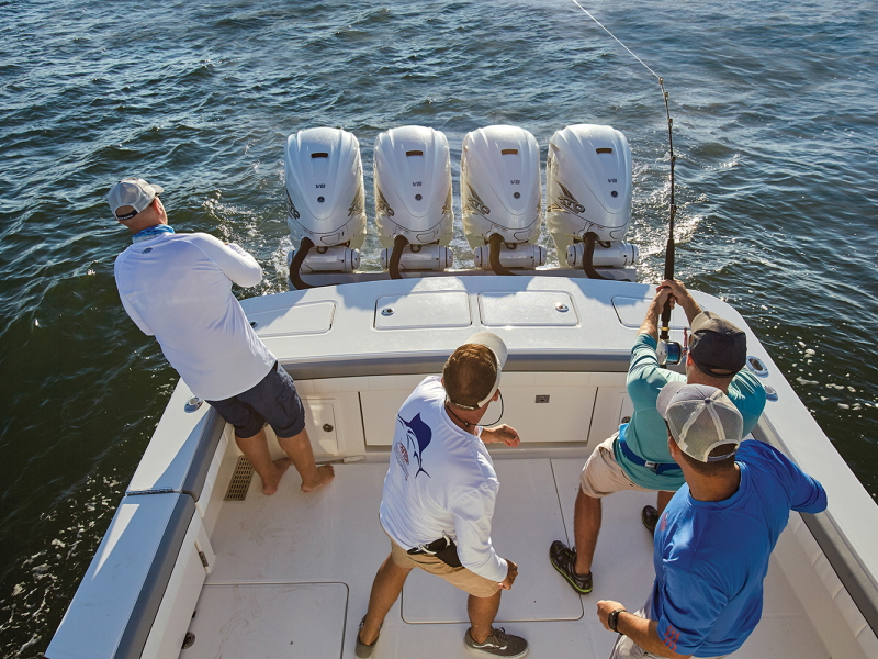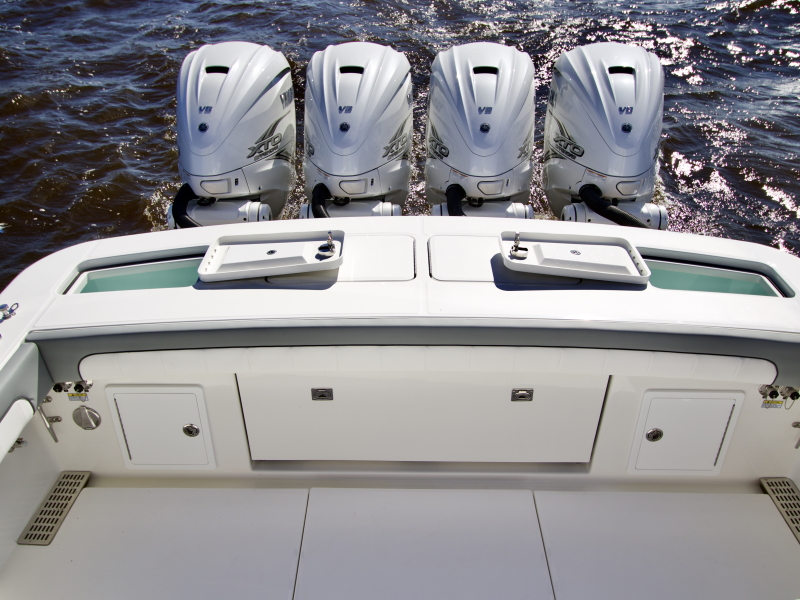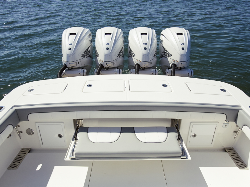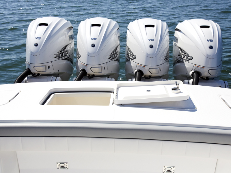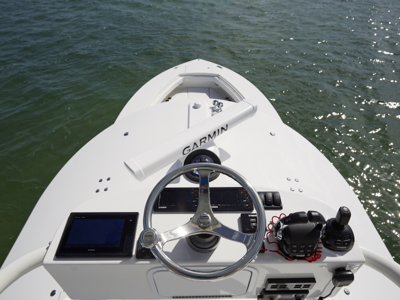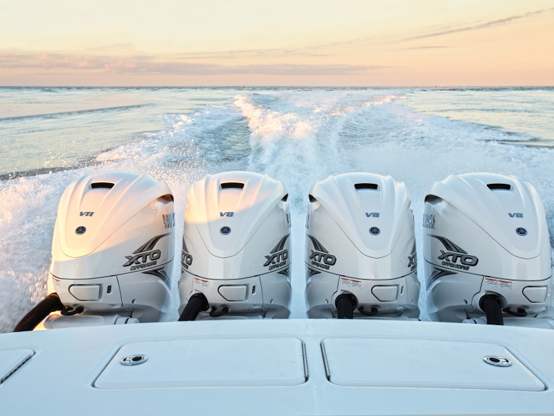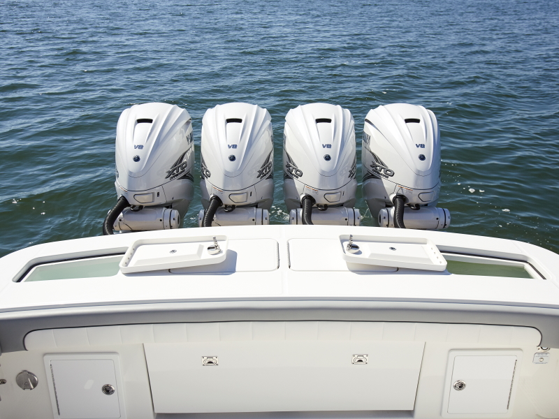 - Quad White Yamaha XF425 4-Stroke Engines with DES Tilt Helm and DEC – Plus Helm Master® EX Joystick with Multimode Set Point™, EX Autopilot with Waypoint Deceleration, and Electronic Key Switch with Wireless Fob