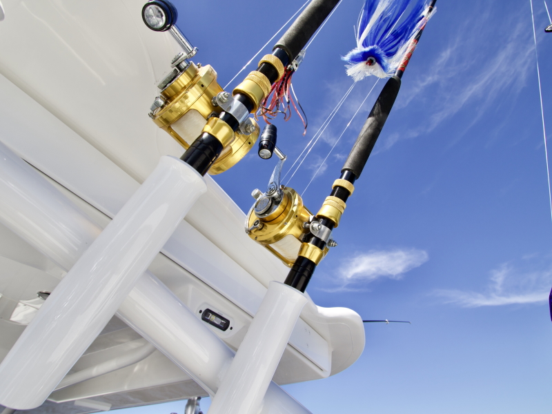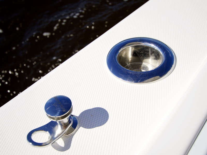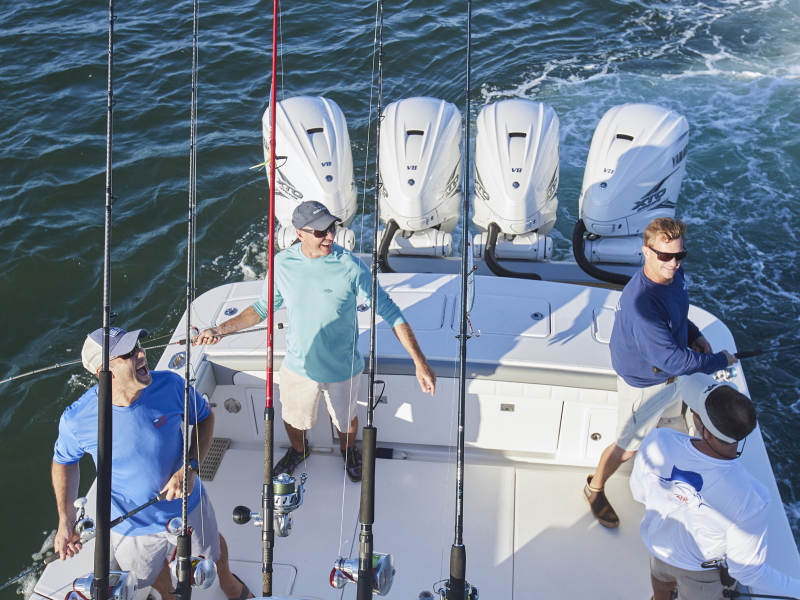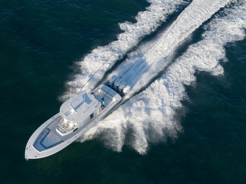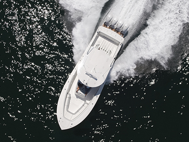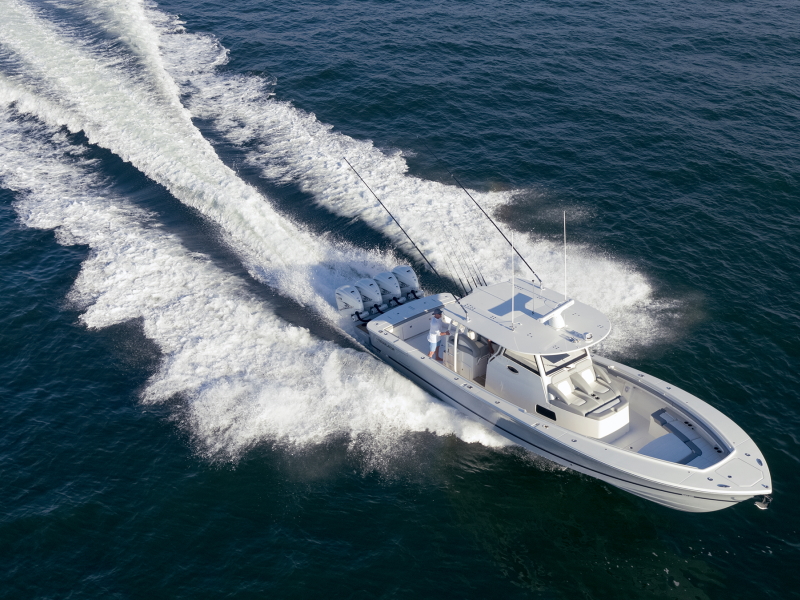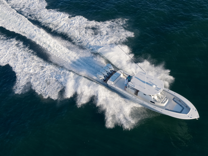 - Quad White Yamaha XF425 4-Stroke Engines with DES Tilt Helm and DEC – Plus Helm Master® EX Joystick with Multimode Set Point™, EX Autopilot with Waypoint Deceleration, and Electronic Key Switch with Wireless Fob
