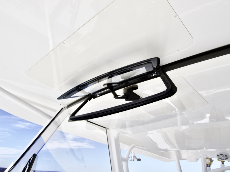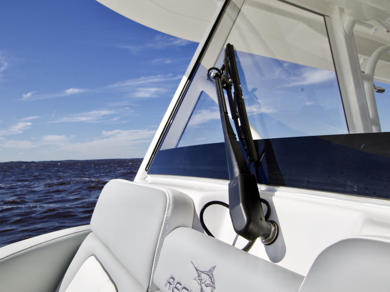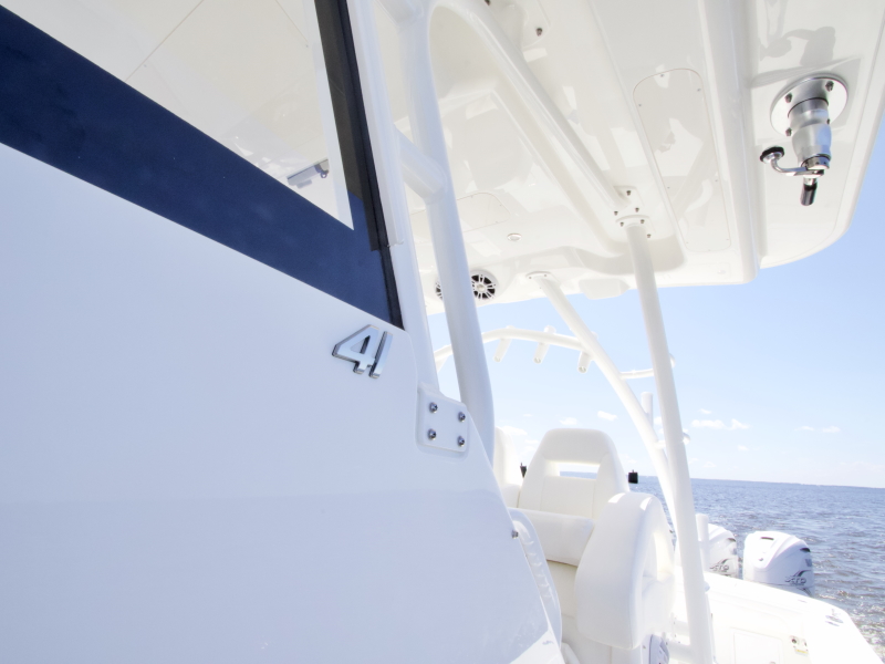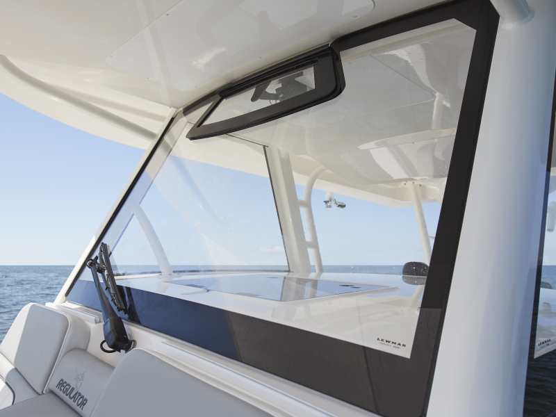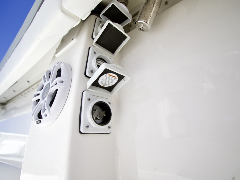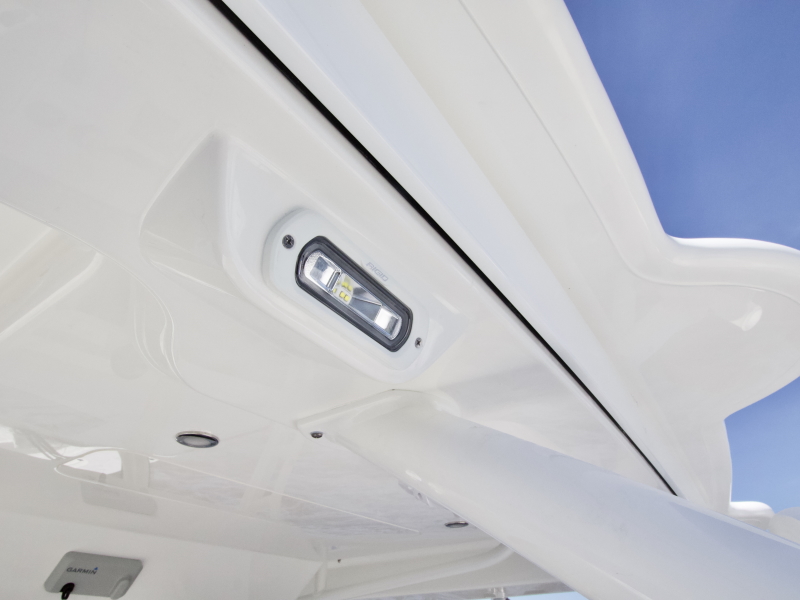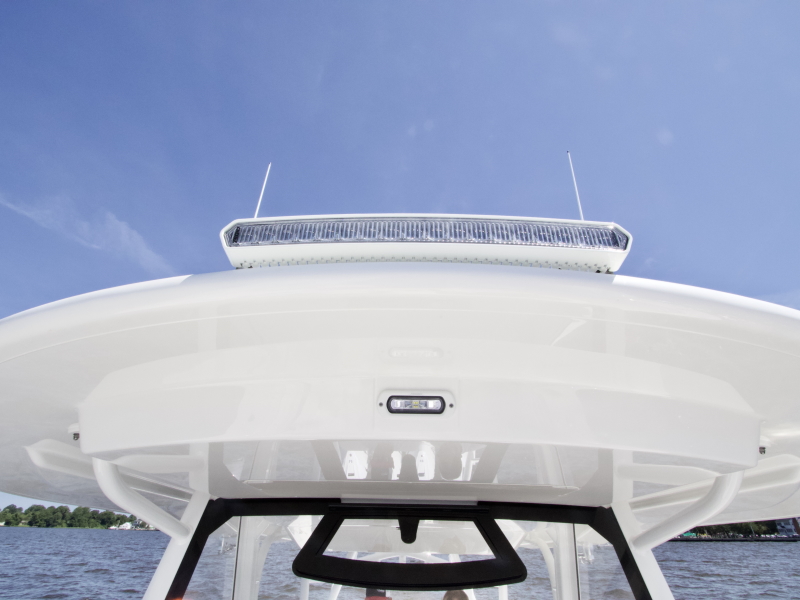 - Fiberglass T-Top with Surfboard Edges, Electronics Box, Integrated Navigation/Dock Lighting, Spreader Lights, and Multi-Colored LED Lights – Complete with Integrated, Vented, Wraparound Windshield and Windshield Wiper/Washer, Plus Rocket Launchers Built into Aft Support Frame