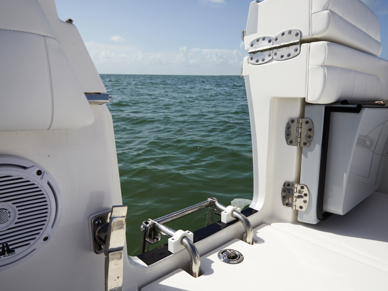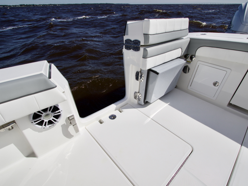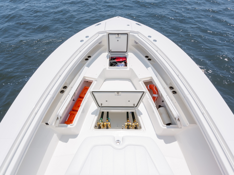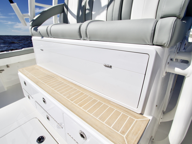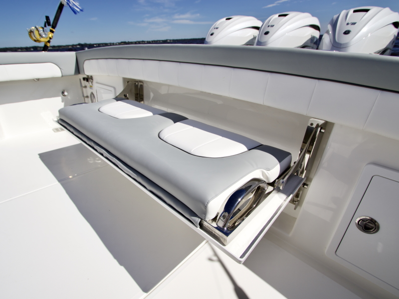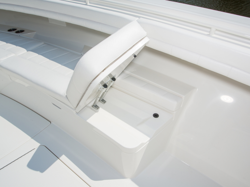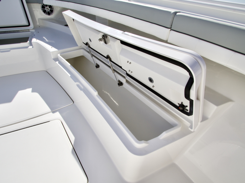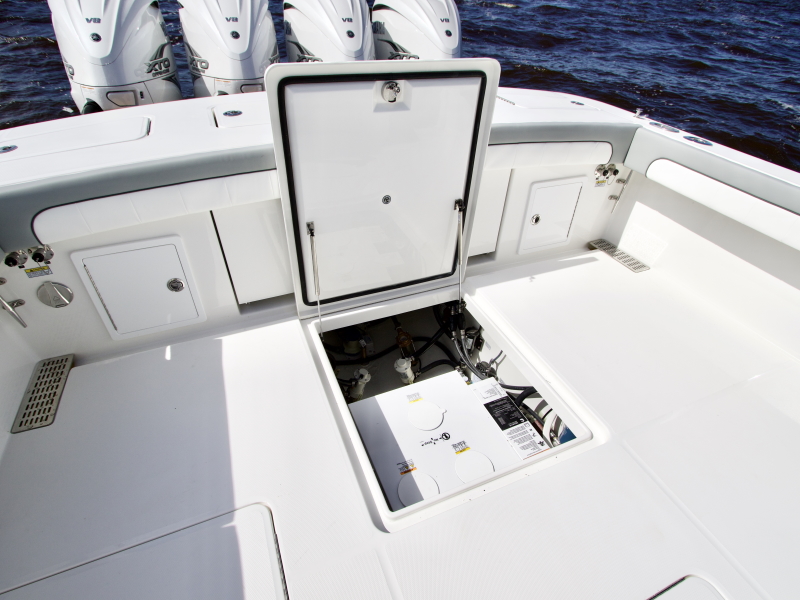 - Fully Accessible, Illuminated Pump Room Beneath Aft Bench Seat (Fuel Tanks, Optional Seakeeper® 5, & Other Systems Access, and Extra Storage)