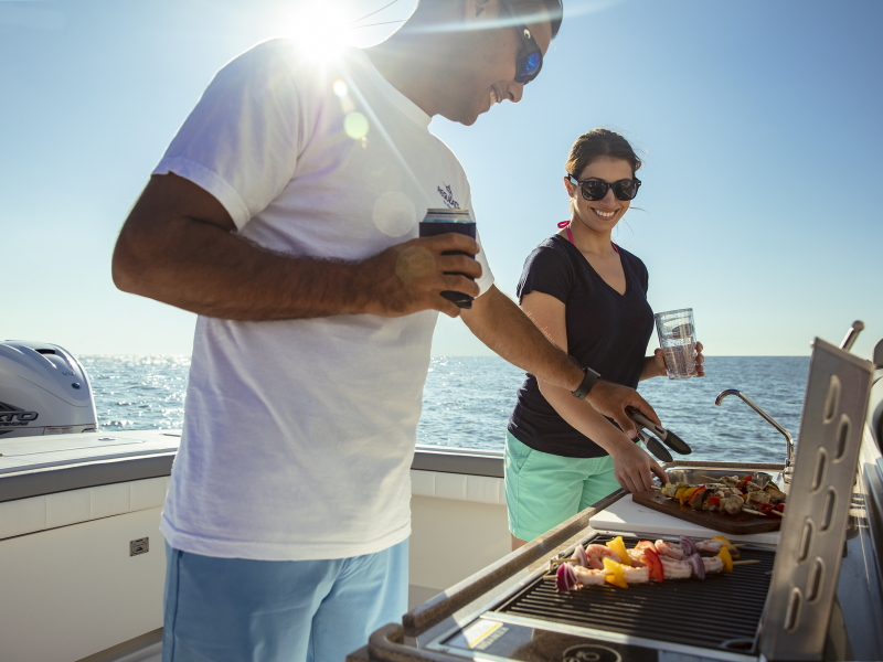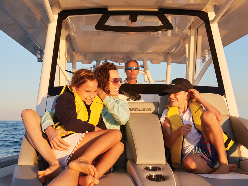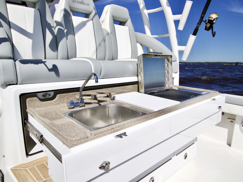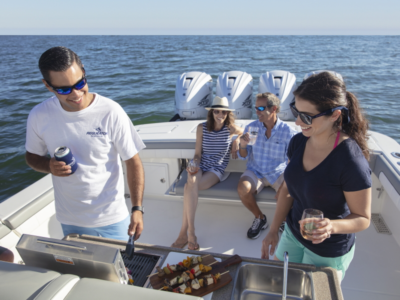 Powered by quad Yamaha 425s with Helm Master® EX and equipped with Seakeeper® 5, the 41 meets your every offshore need. The new Offshore Command Center features Garmin® Multi-Function Display with Digital Switching and Monitoring, along with proprietary Regulator MyHelm™ interface to seamlessly and intuitively connect key functions in one application – with wireless key fob to trigger lighting, batteries, and more as you approach or disembark with the touch of a button. Serious anglers will love the optional outrigger bases with 22’ Carbon Fiber collapsible poles and huge livewell and fishbox capacity. Aft mezzanine seat with prep & tackle center and automated rear shade provide additional cockpit seating without compromising fishing amenities. Easy tower access makes the dual helm even more attractive and below deck, the newly-redesigned cabin features Chilewich accents, galley kitchen, double berth, and spacious head with shower, allowing you to accommodate friends and family with ease.