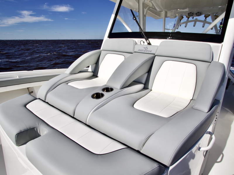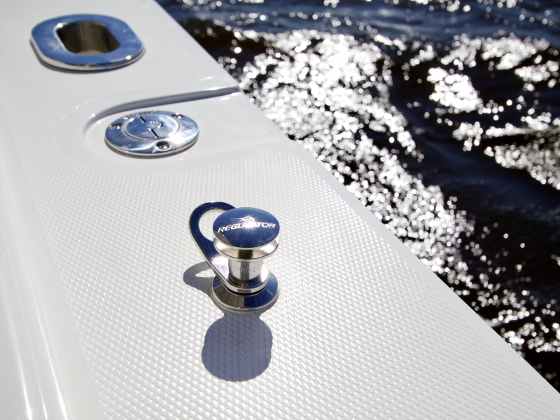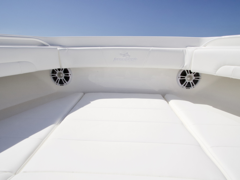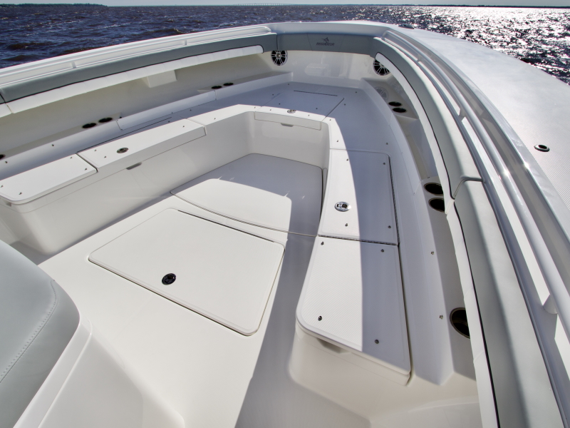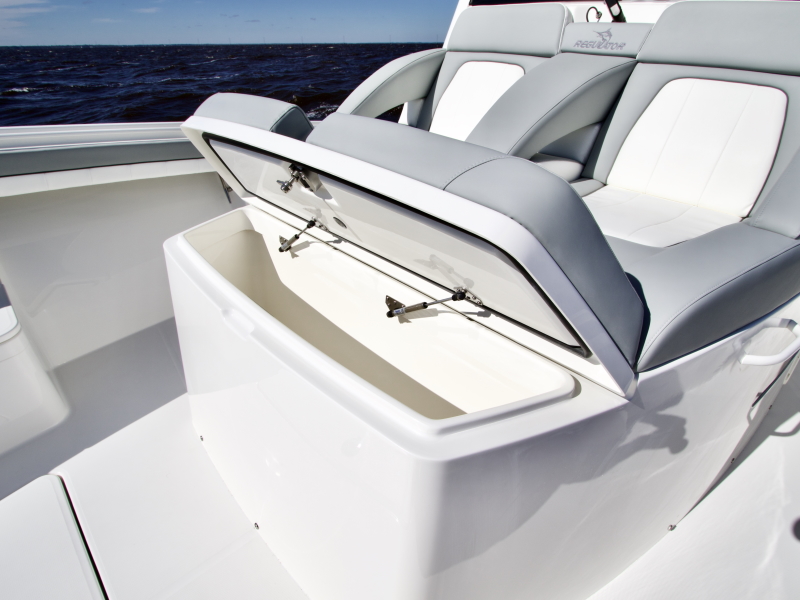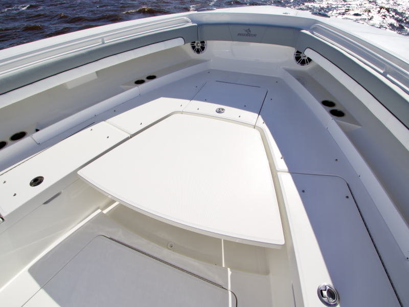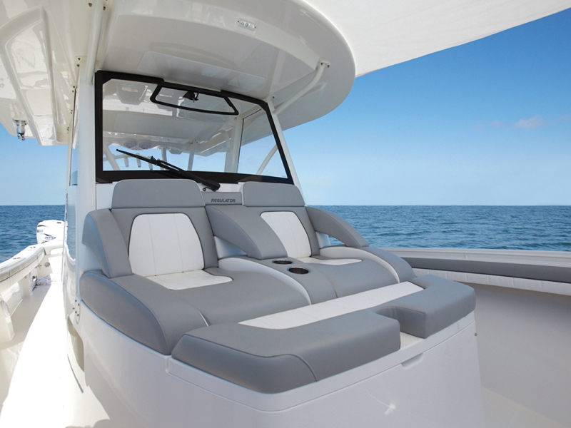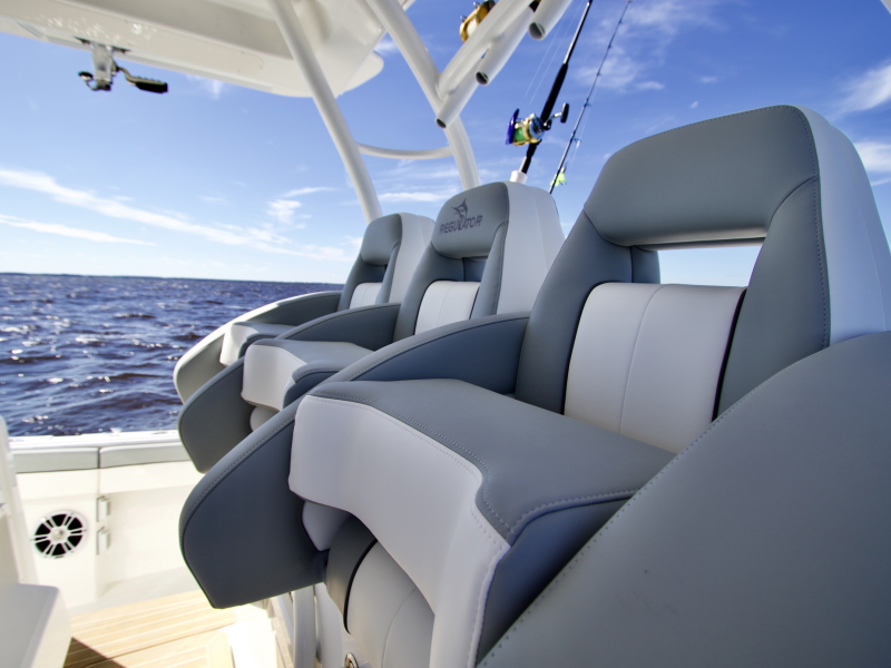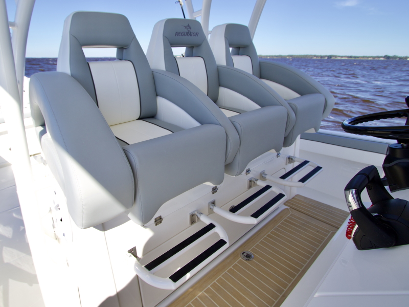- Regulator E-Series Triple Helm Seating & Tackle Center: Features Raised-Deck, Triple Helm Seating with Armrests, Flip-Up Bolsters, and Individual Folding Footrests with SoftGrip Foot Rail – with Aft-Facing Bench Seat for Two Flanked by Built-In Armrests with Cup Holder Rod Holders, Tackle Storage, (6) Rocket Launchers Built into Aft Support Frame, and Pump Room with Fuel Tank Access