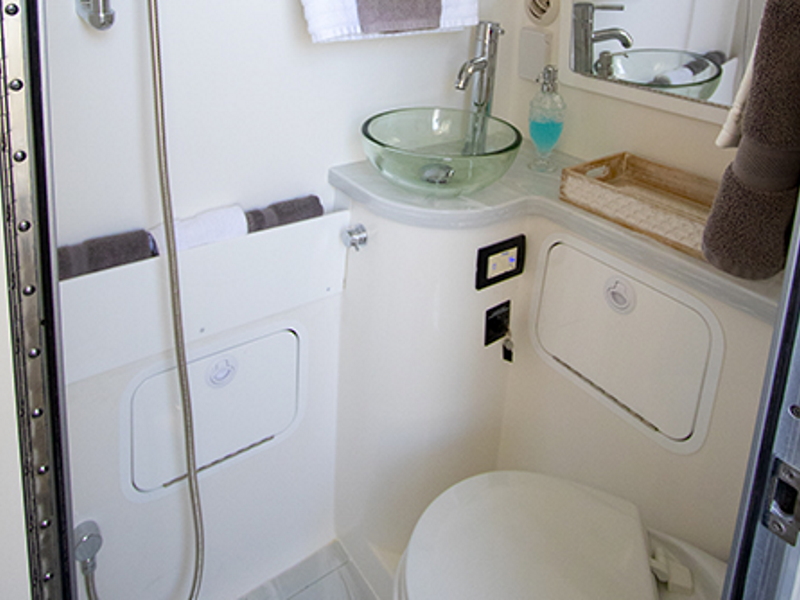 - Stand-Up Head Compartment with Solid Surface Countertop, Sink with Hot Water, Interior Lighting, and Mirror