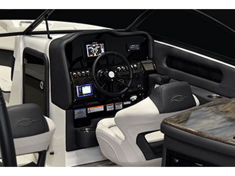 - The dash features glare-proof Simrad® controls, while the helm offers subtle comforts like a throttle arm rest, cell phone holder, recessed storage and sporty handling. Helm console offers serious room with dedicated cooler storage and shelves.
