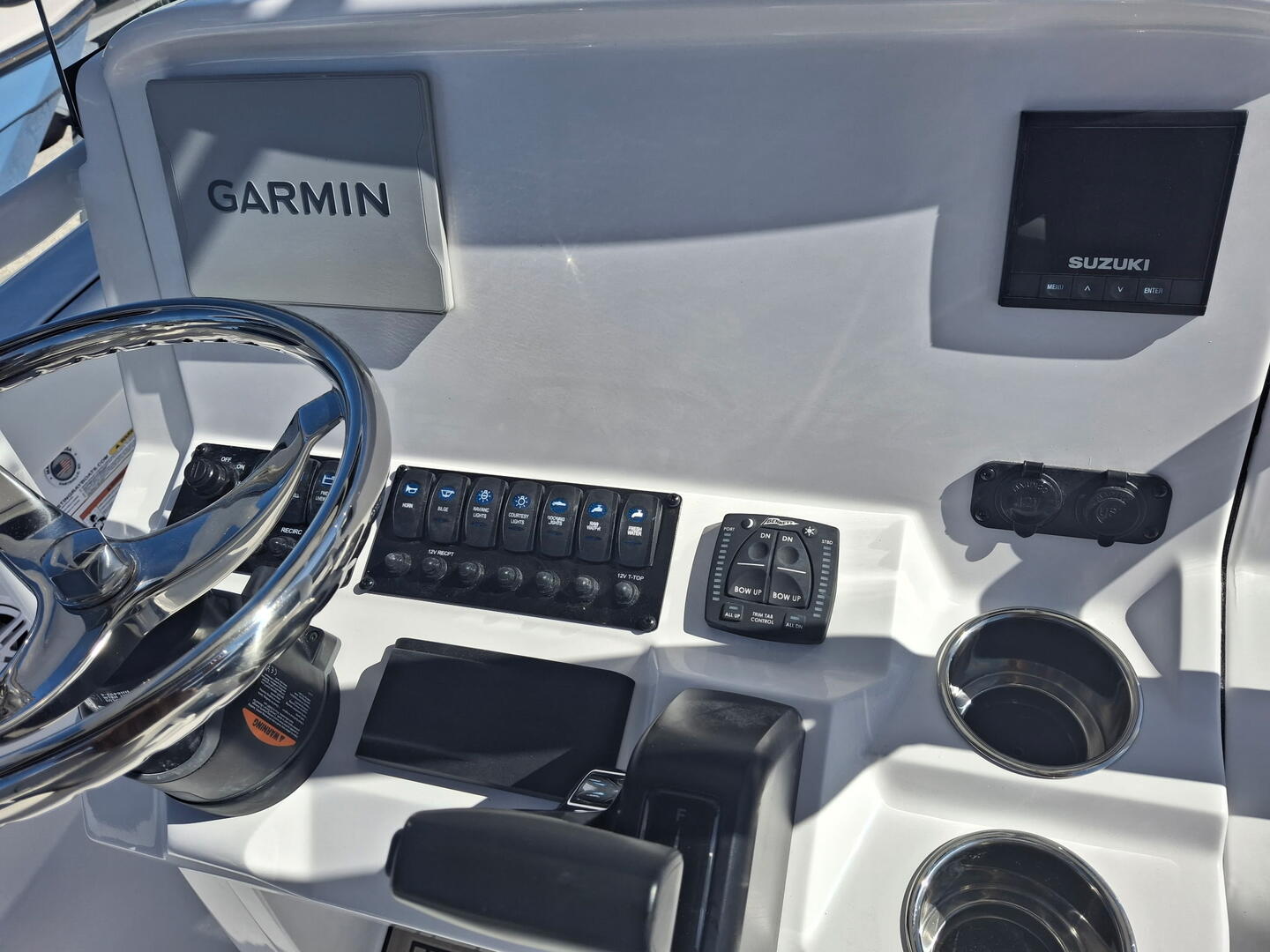 At the helm: a deluxe console with backlit instruments, stainless-steel steering wheel, integrated 12 V + dual USB ports, space for electronics (GPS, fishfinder), and plenty of flat mounting area for customization. sammarine.com+1